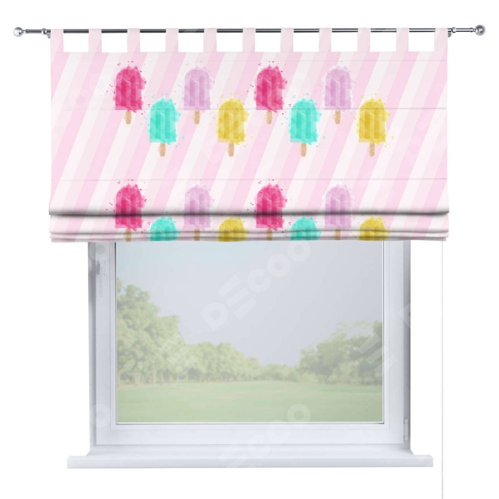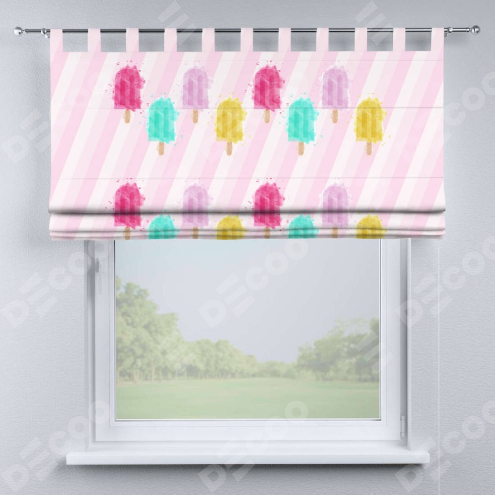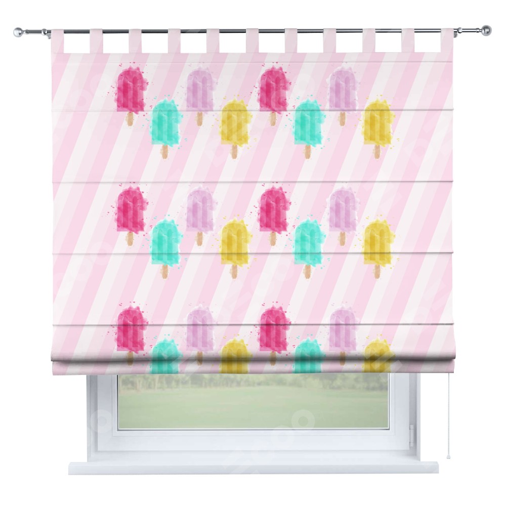 Римская штора производителя «Cortin», используется для проёма, пошита из ткани блэкаут с нанесением сублимационной печати «Фруктовое мороженое». Данная модель пошита на петлях, комплектуется на выбор круглым карнизом и подходит для монтажа на стену. Римская штора на петлях имеет простую систему регулировки высоты, отличительным преимуществом данной модели является простой способ монтажа. Достаточно повесить ее на трубу и штора готова!