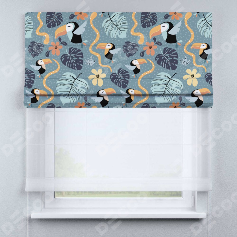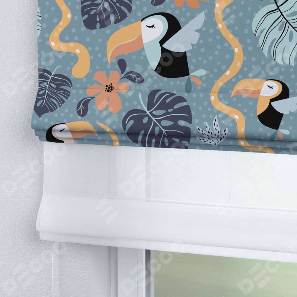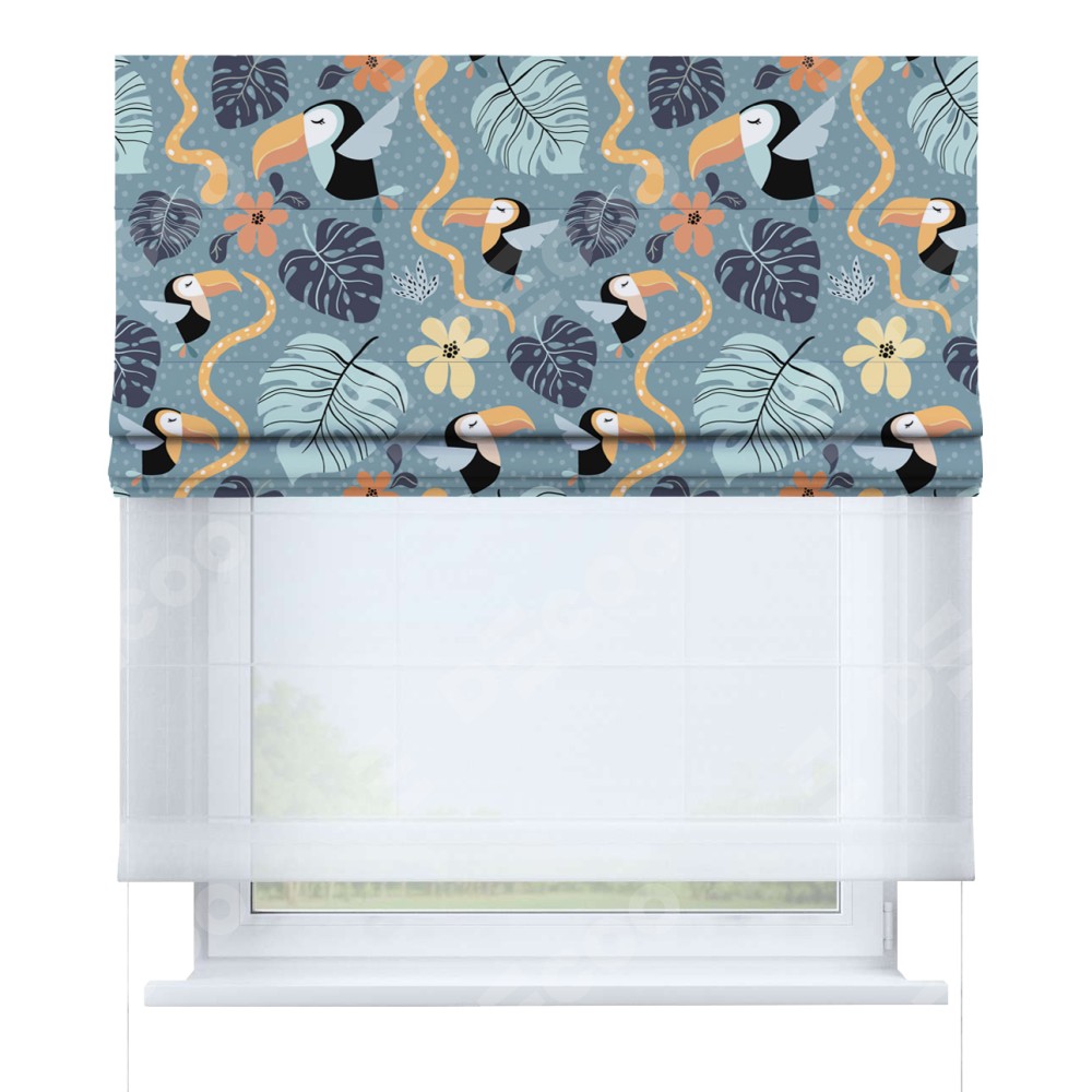 Римская штора день-ночь производителя «Cortin», используется для проёма, пошита из двух полотен, с лицевой блэкаут с нанесением сублимационной печати «Экзотические птицы», вторая ткань тюль (по стандарту комплектуется тюль белого цвета артикул V-01). Имеет универсальный механизм и подходит для монтажа: на потолок, на стену и в нишу.