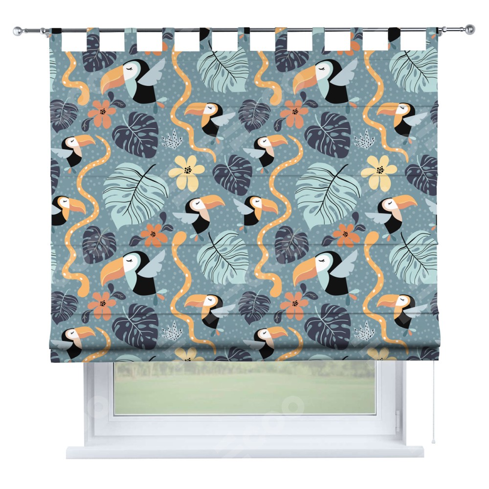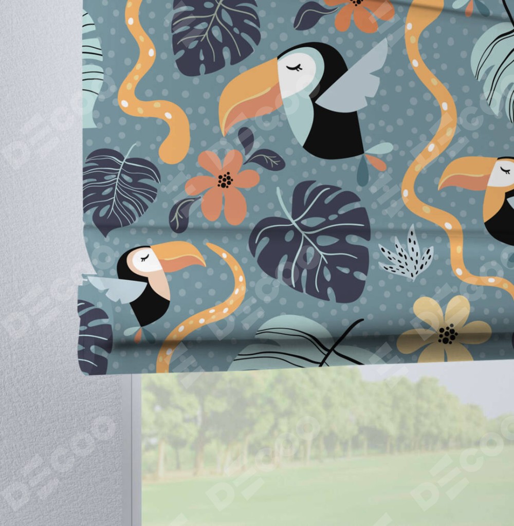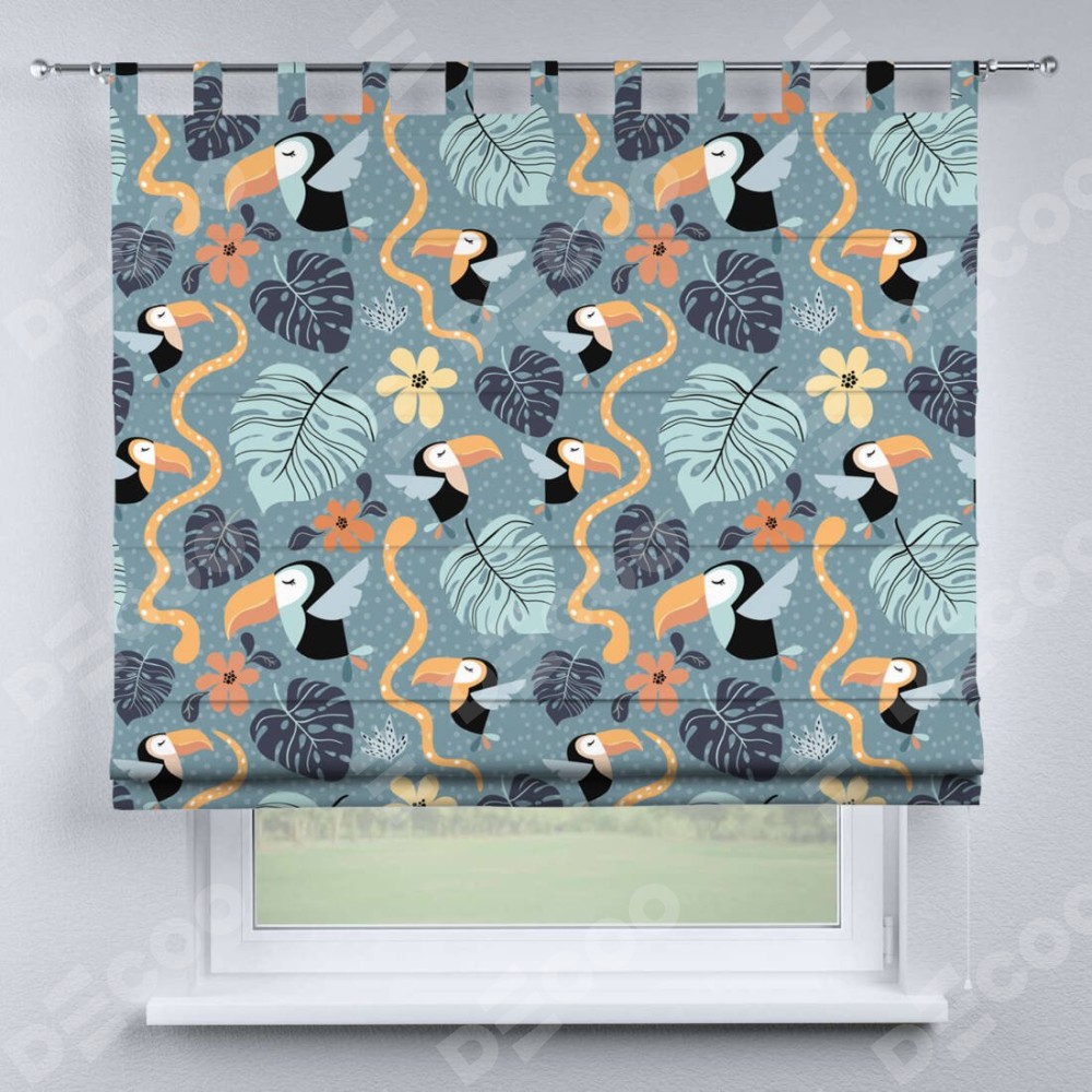 Римская штора производителя «Cortin», используется для проёма, пошита из ткани блэкаут с нанесением сублимационной печати «Экзотические птицы». Данная модель пошита на петлях, комплектуется на выбор круглым карнизом и подходит для монтажа на стену. Римская штора на петлях имеет простую систему регулировки высоты, отличительным преимуществом данной модели является простой способ монтажа. Достаточно повесить ее на трубу и штора готова!