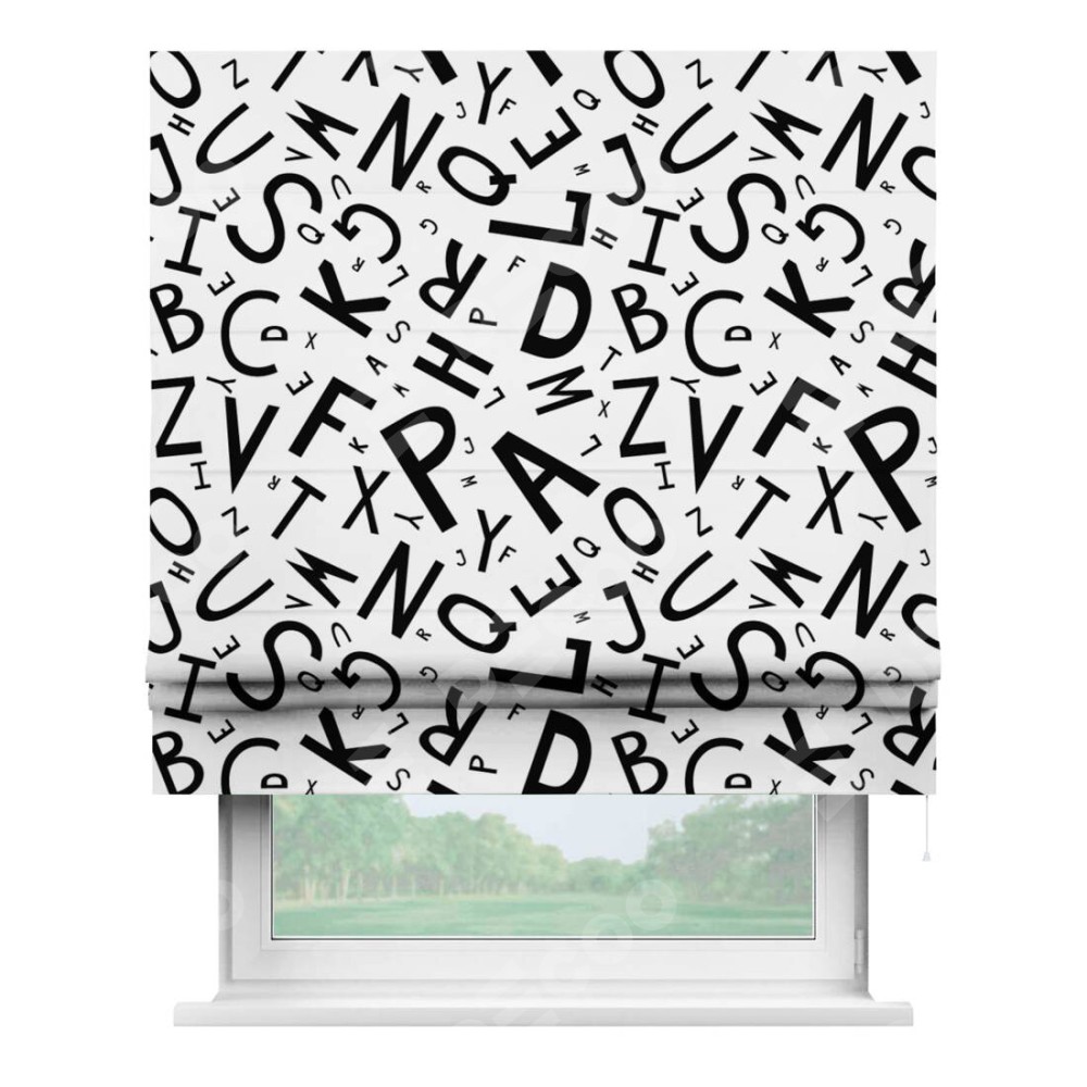Римская штора «Кортин» для проема «Литеры на белом» предоставлена в следующих характеристиках: