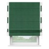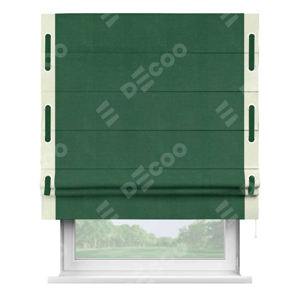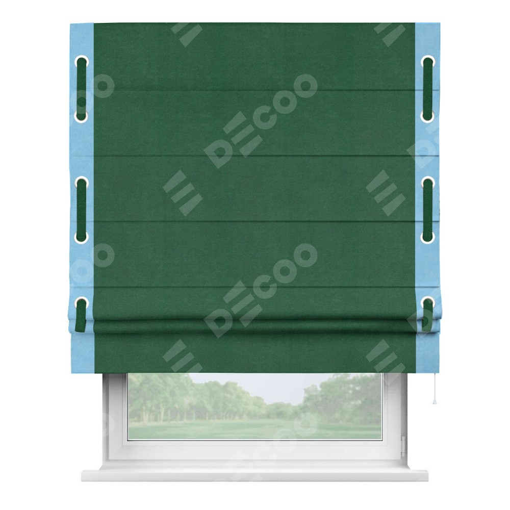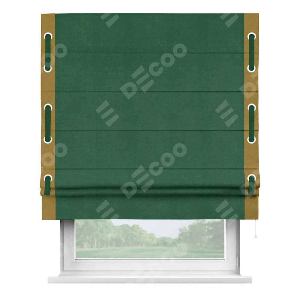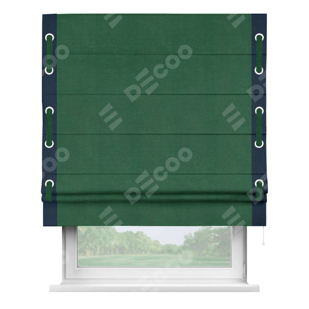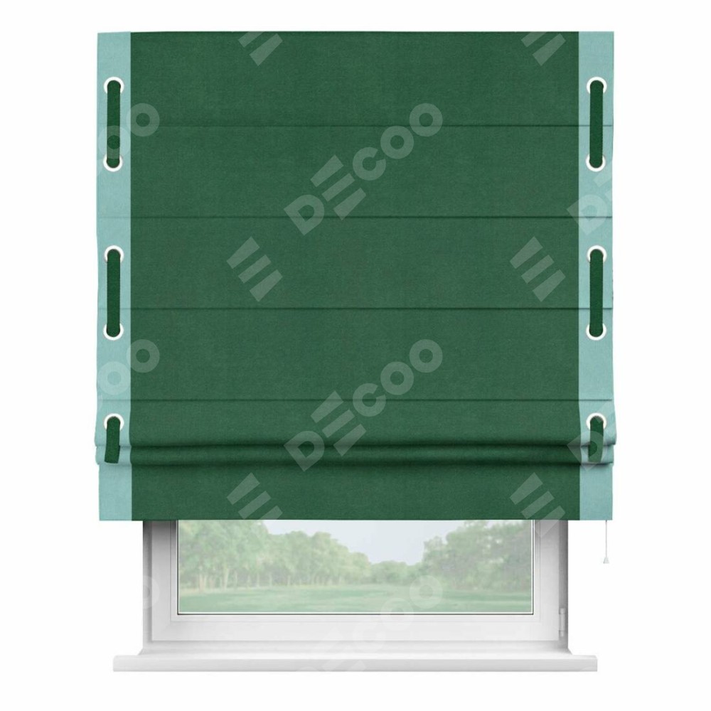 Римская штора производителя «Cortin», используется для проёма, пошита из ткани вельвет зеленый, артикул ткани 85546. Отделка шторы кантом «Стрим Дуо» на кантах расположены люверсы с пояском, ткань для канта используется из вельвета разной расцветки на выбор. Ткань для пояска обычно используется из основной ткани шторы, а так же можно сделать из любой расцветки по желанию. Имеет универсальный механизм и подходит для монтажа: на потолок, на стену и в нишу.