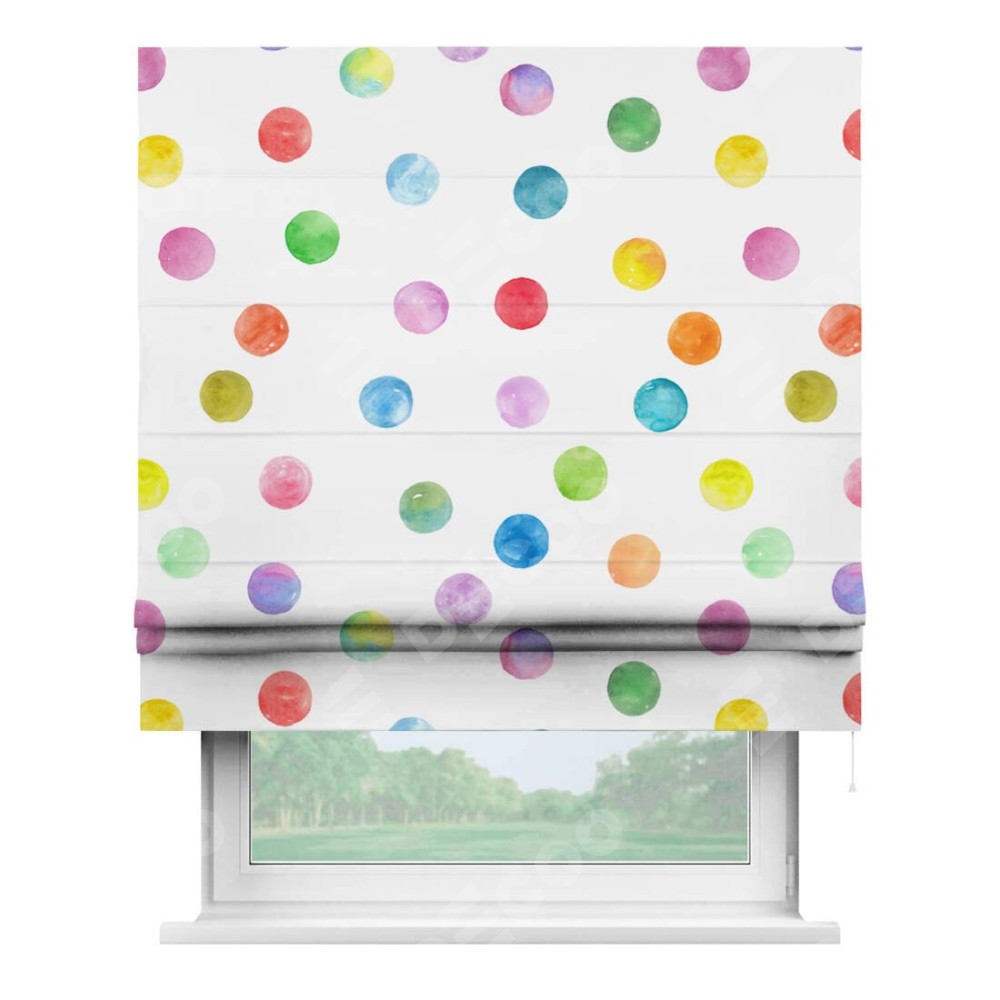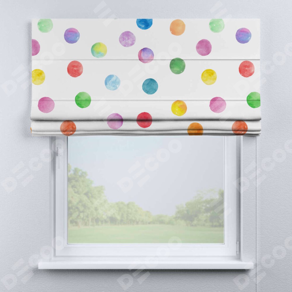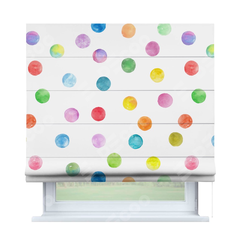 Римская штора производителя «Cortin», используется для проёма, пошита из ткани блэкаут с нанесением сублимационной печати «Цветные круги». Имеет универсальный механизм и подходит для монтажа: на потолок, на стену и в нишу.