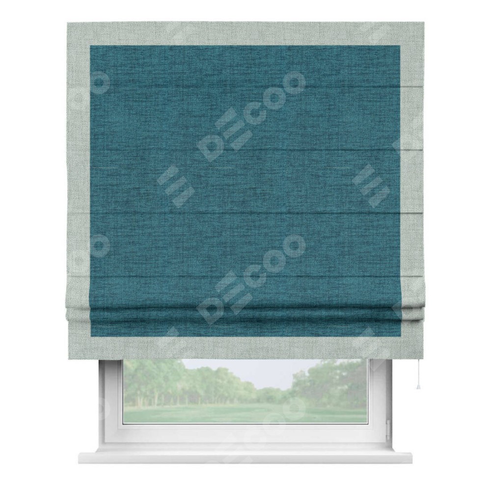 Римская штора производителя «Cortin», используется для проёма, пошита из ткани рогожка димаут синий, артикул 80422. Отделка шторы кантом «Чесс», ткань для канта используется из рогожки димаут разной расцветки на выбор. Имеет универсальный механизм и подходит для монтажа: на потолок, на стену и в нишу.