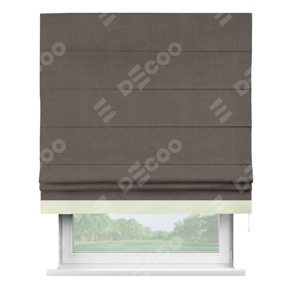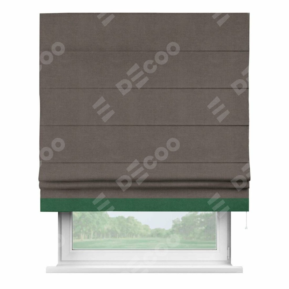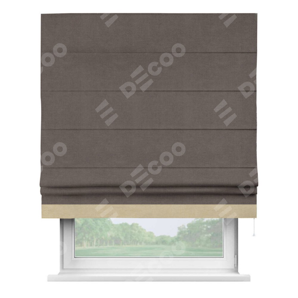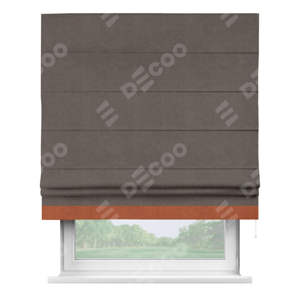 Римская штора производителя «Cortin», используется для проёма, пошита из ткани вельвет коричневый, артикул ткани 14135. Отделка шторы кантом «Джестер», ткань для канта используется из вельвета разной расцветки на выбор. Имеет универсальный механизм и подходит для монтажа: на потолок, на стену и в нишу.