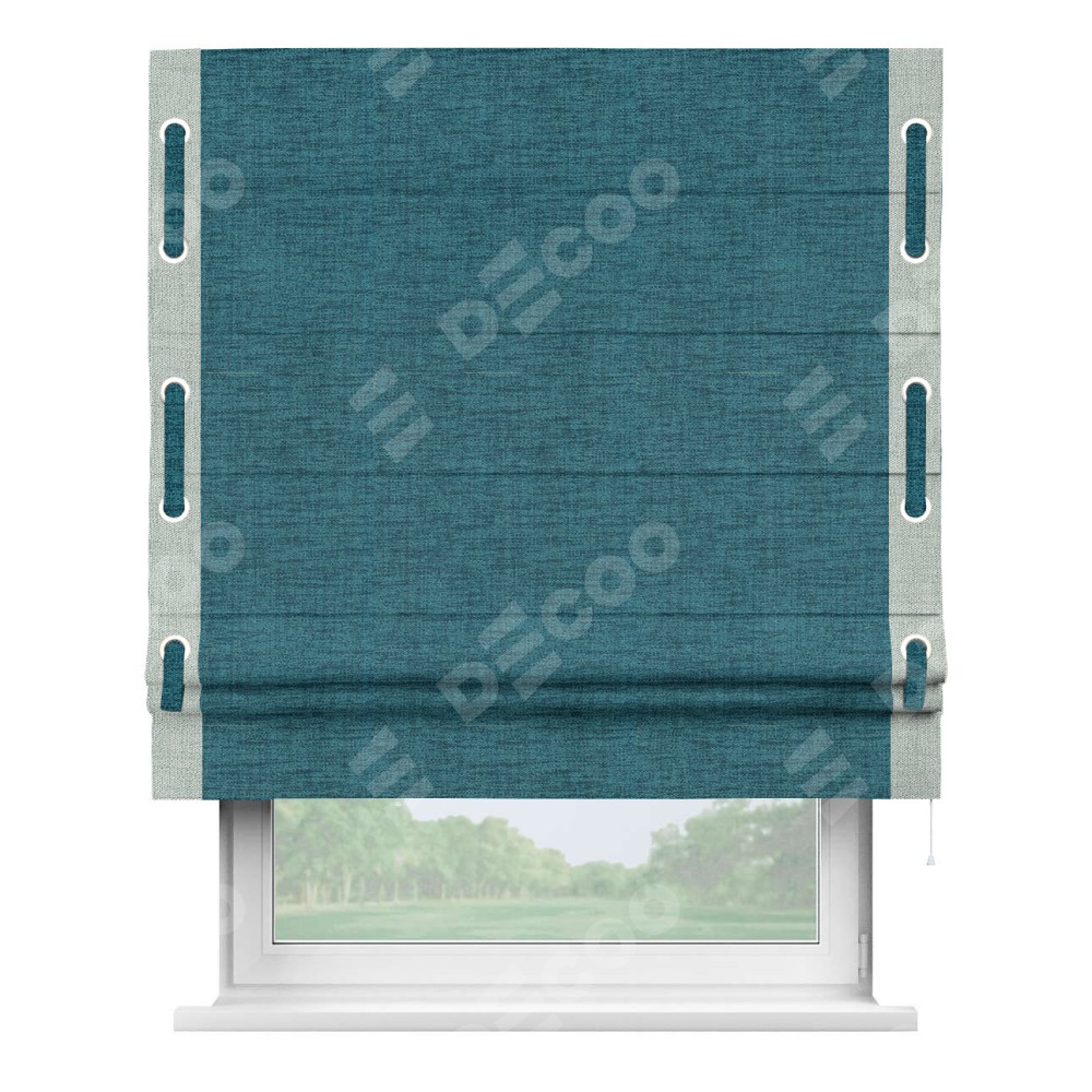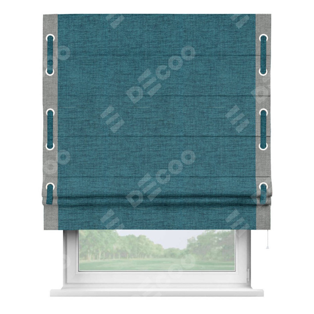 Римская штора производителя «Cortin», используется для проёма, пошита из ткани рогожка димаут синий, артикул 80422. Отделка шторы кантом «Стрим Дуо» на кантах расположены люверсы с пояском, ткань для канта используется из рогожки разной расцветки на выбор. Ткань для пояска обычно используется из основной ткани шторы, а так же можно сделать из любой расцветки по желанию. Имеет универсальный механизм и подходит для монтажа: на потолок, на стену и в нишу.