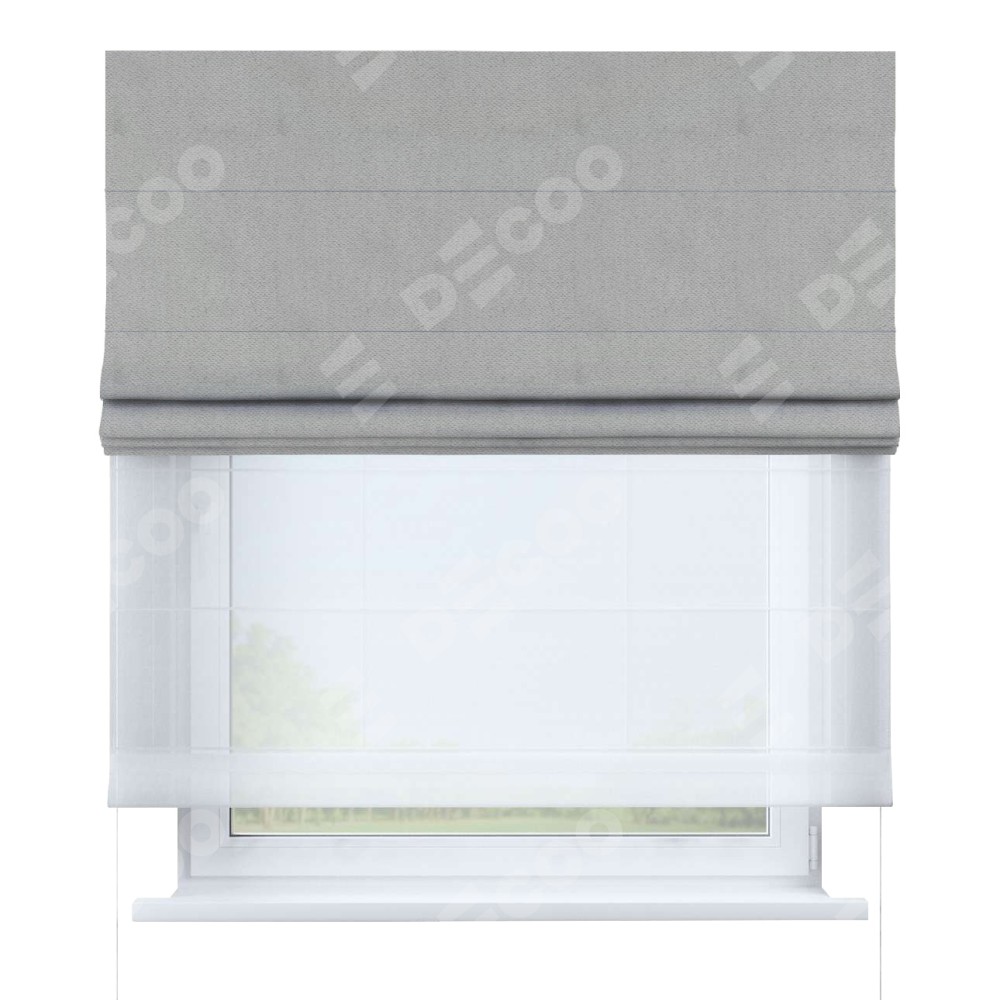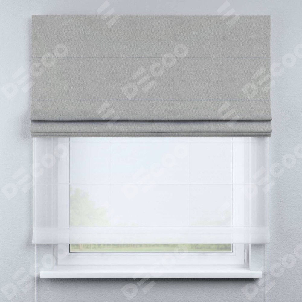 Римская штора день-ночь производителя «Cortin», используется для проёма, пошита из двух полотен, с лицевой стороны блэкаут с блеском тёмно-серый артикул 34634, вторая ткань тюль (по стандарту комплектуется тюль белого цвета артикул V-01). Изнаночная сторона основного материала черного цвета, что обеспечивает необходимую светонепроницаемость. Имеет универсальный механизм и подходит для монтажа: на потолок, на стену и в нишу.