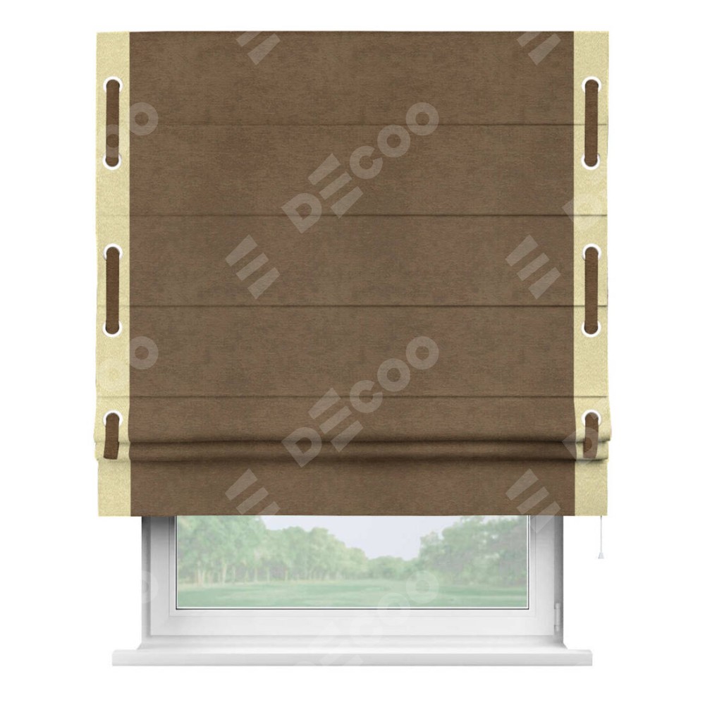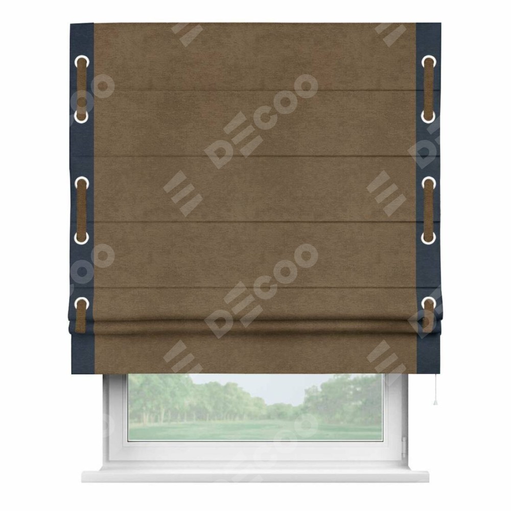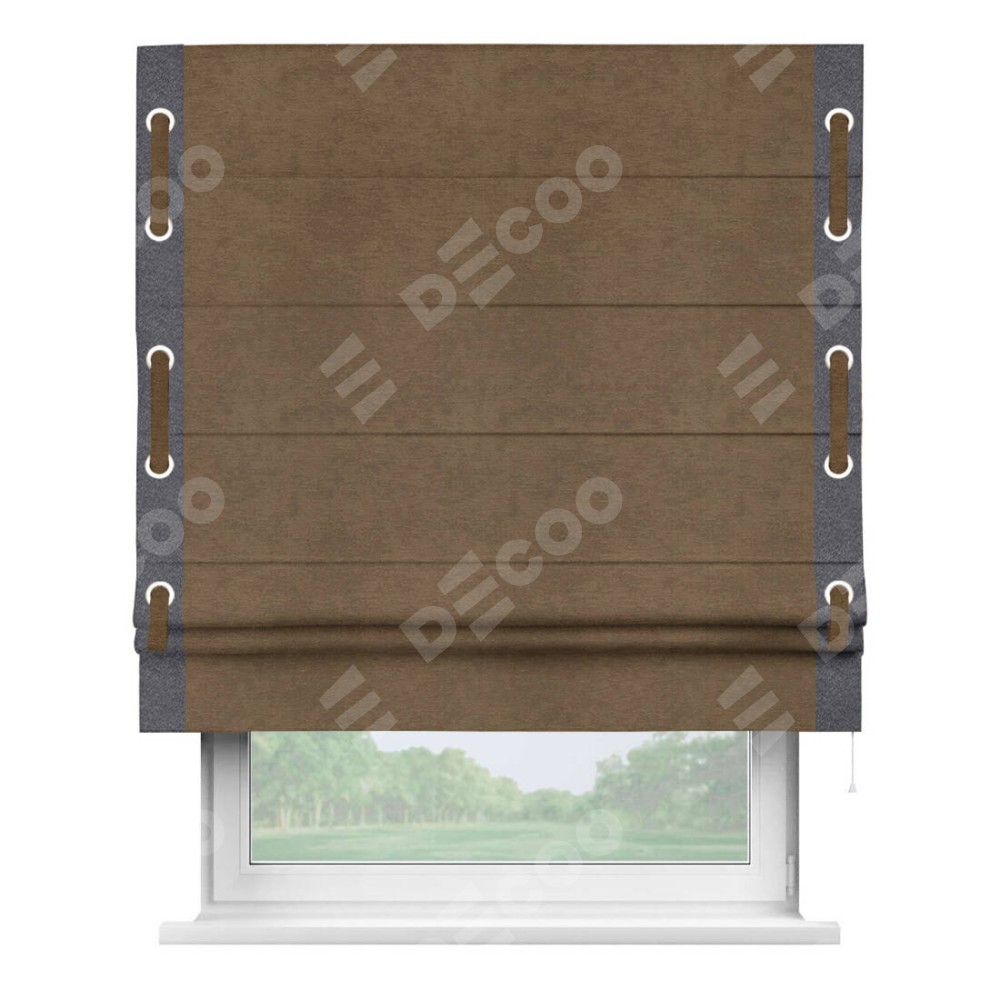 Римская штора производителя «Cortin», используется для проёма, пошита из ткани софт однотонный бронзовый, артикул 33099. Отделка шторы кантом «Стрим Дуо» на кантах расположены люверсы с пояском, ткань для канта используется из софта разной расцветки на выбор. Ткань для пояска обычно используется из основной ткани шторы, а так же можно сделать из любой расцветки по желанию. Имеет универсальный механизм и подходит для монтажа: на потолок, на стену и в нишу.