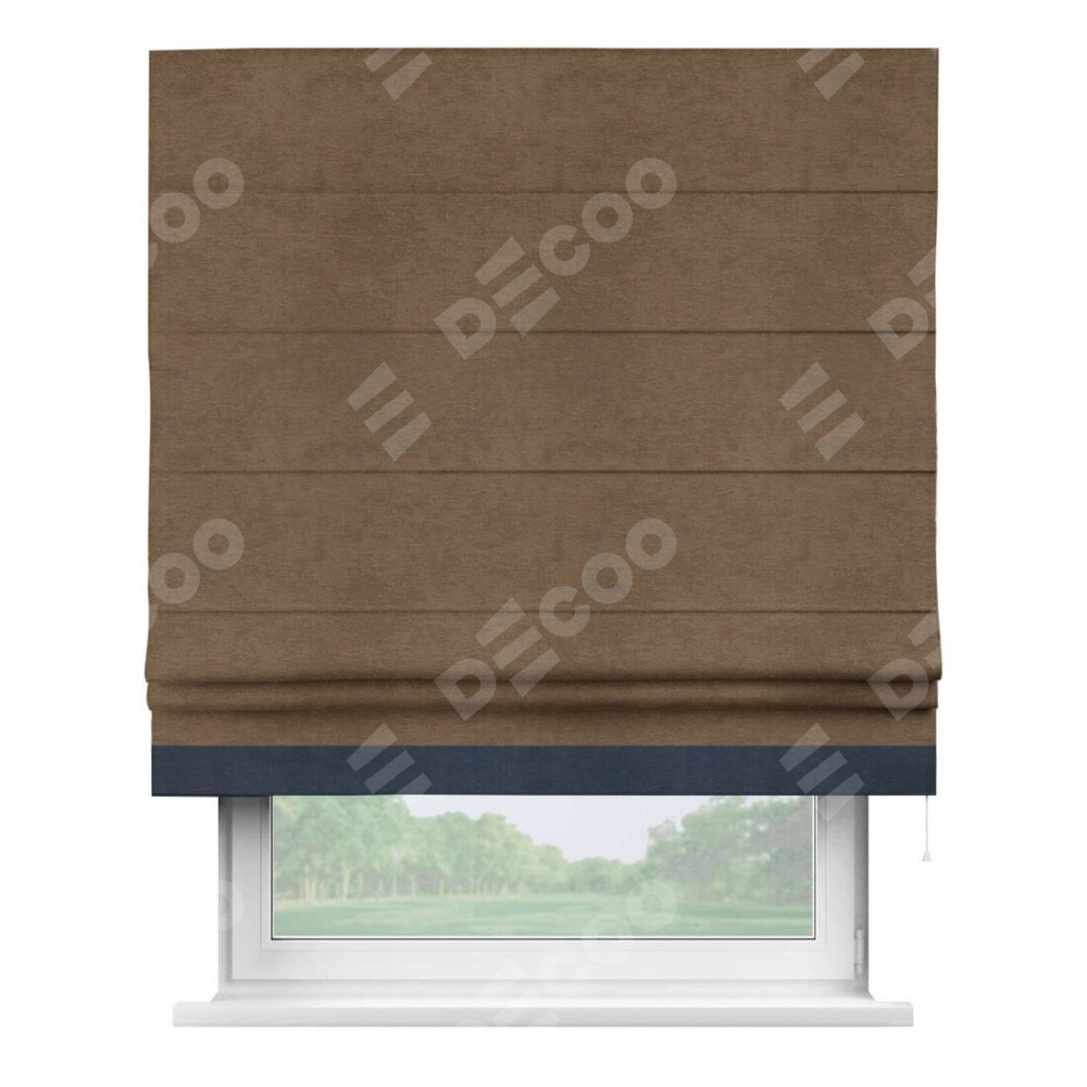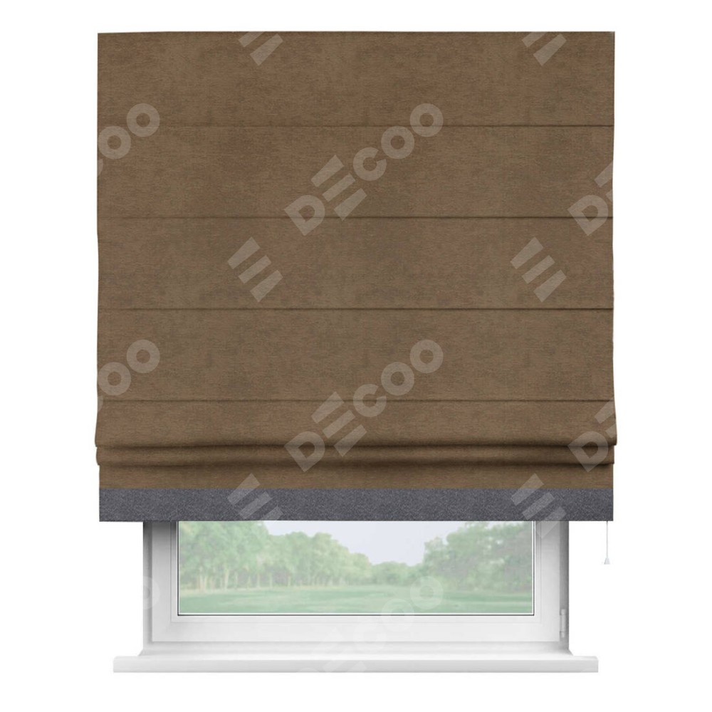 Римская штора производителя «Cortin», используется для проёма, пошита из ткани софт однотонный бронзовый, артикул 33099. Отделка шторы кантом «Джестер», ткань для канта используется из софта разной расцветки на выбор. Имеет универсальный механизм и подходит для монтажа: на потолок, на стену и в нишу.