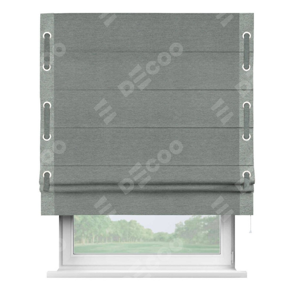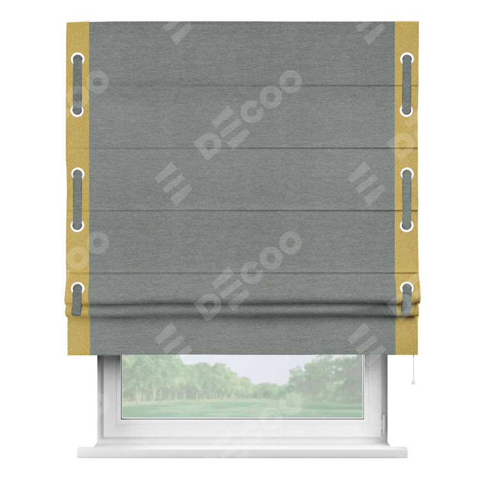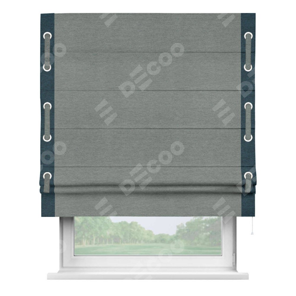 Римская штора производителя «Cortin», используется для проёма, пошита из ткани твид блэкаут серый, артикул 21577. Отделка шторы кантом «Стрим Дуо» на кантах расположены люверсы с пояском, ткань для канта используется из твида разной расцветки на выбор. Ткань для пояска обычно используется из основной ткани шторы, а так же можно сделать из любой расцветки по желанию. Имеет универсальный механизм и подходит для монтажа: на потолок, на стену и в нишу.