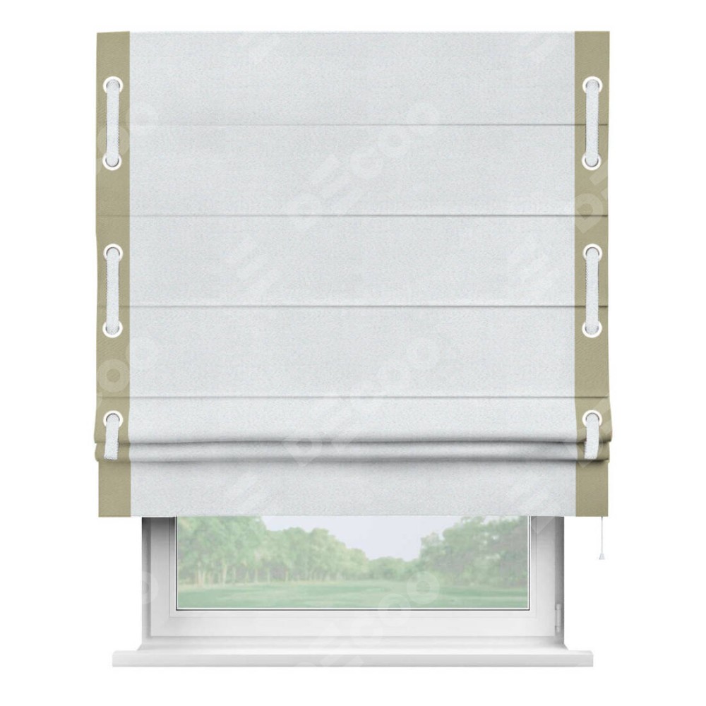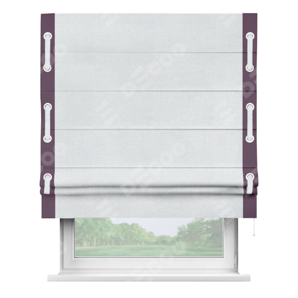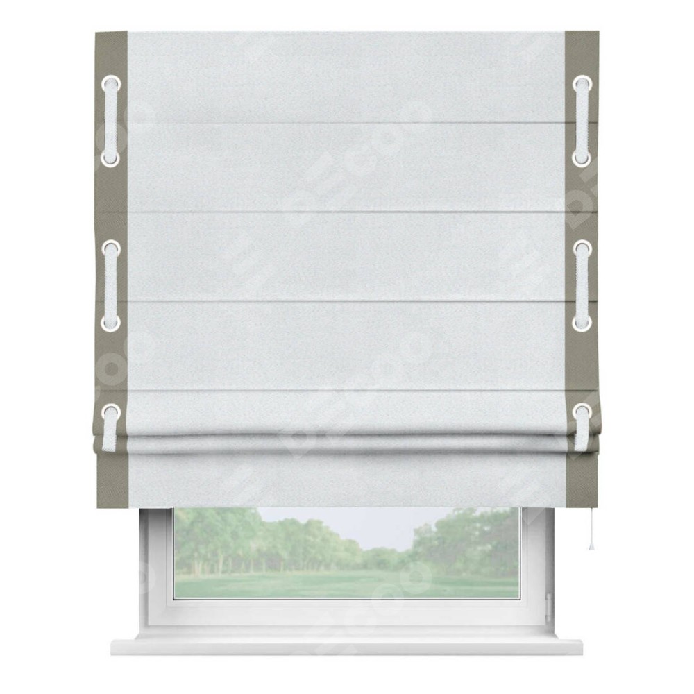 Римская штора производителя «Cortin», используется для проёма, пошита из ткани блэкаут однотонный дымчато-белый, артикул ткани 101. Отделка шторы кантом «Стрим Дуо» на кантах расположены люверсы с пояском, ткань для канта используется из блэкаута однотонного разной расцветки на выбор. Ткань для пояска обычно используется из основной ткани шторы, а так же можно сделать из любой расцветки по желанию. Имеет универсальный механизм и подходит для монтажа: на потолок, на стену и в нишу.