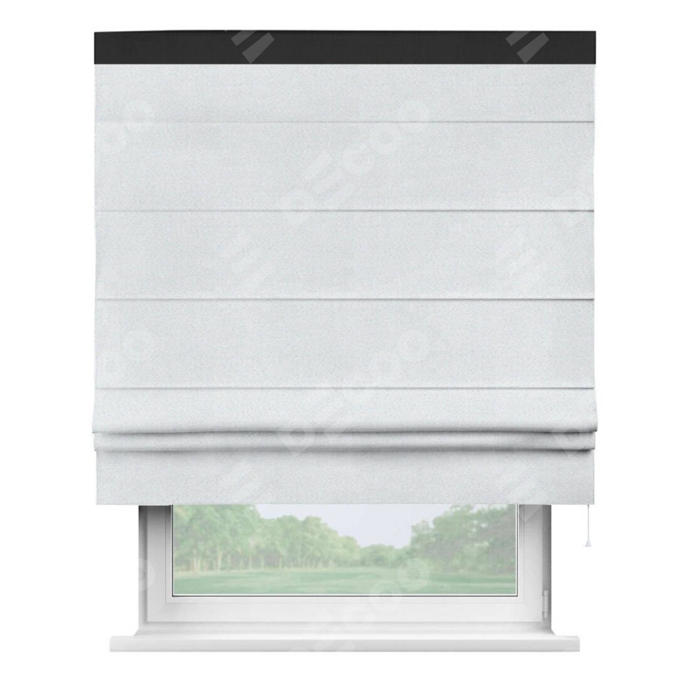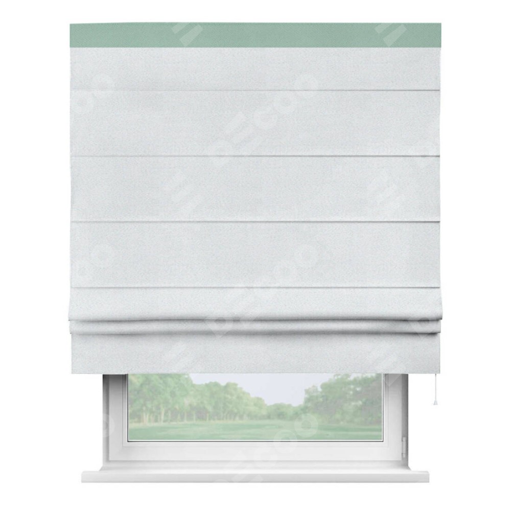 Римская штора производителя «Cortin», используется для проёма, пошита из ткани блэкаут однотонный дымчато-белый, артикул ткани 101. Отделка шторы кантом «Кинг», ткань для канта используется из блэкаута однотонного разной расцветки на выбор. Имеет универсальный механизм и подходит для монтажа: на потолок, на стену и в нишу.