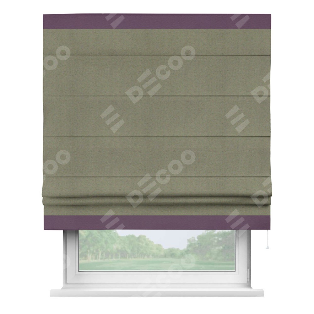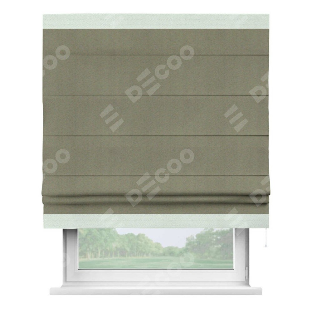 Римская штора производителя «Cortin», используется для проёма, пошита из ткани блэкаут однотонный серо-коричневый, артикул ткани 29568. Отделка шторы кантом «Горизонт», ткань для канта используется из блэкаута однотонного разной расцветки на выбор. Имеет универсальный механизм и подходит для монтажа: на потолок, на стену и в нишу.