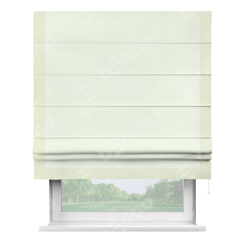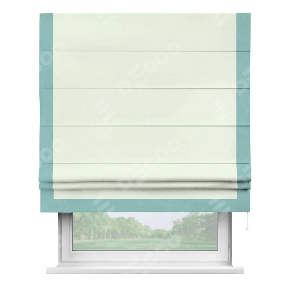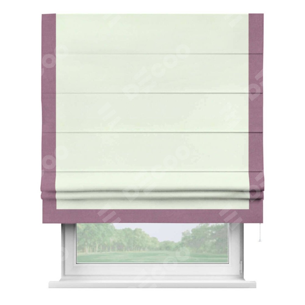 Римская штора производителя «Cortin», используется для проёма, пошита из ткани вельвет кремовый, артикул ткани 85524. Отделка шторы кантом «Виктория», ткань для канта используется из вельвета разной расцветки на выбор. Имеет универсальный механизм и подходит для монтажа: на потолок, на стену и в нишу.