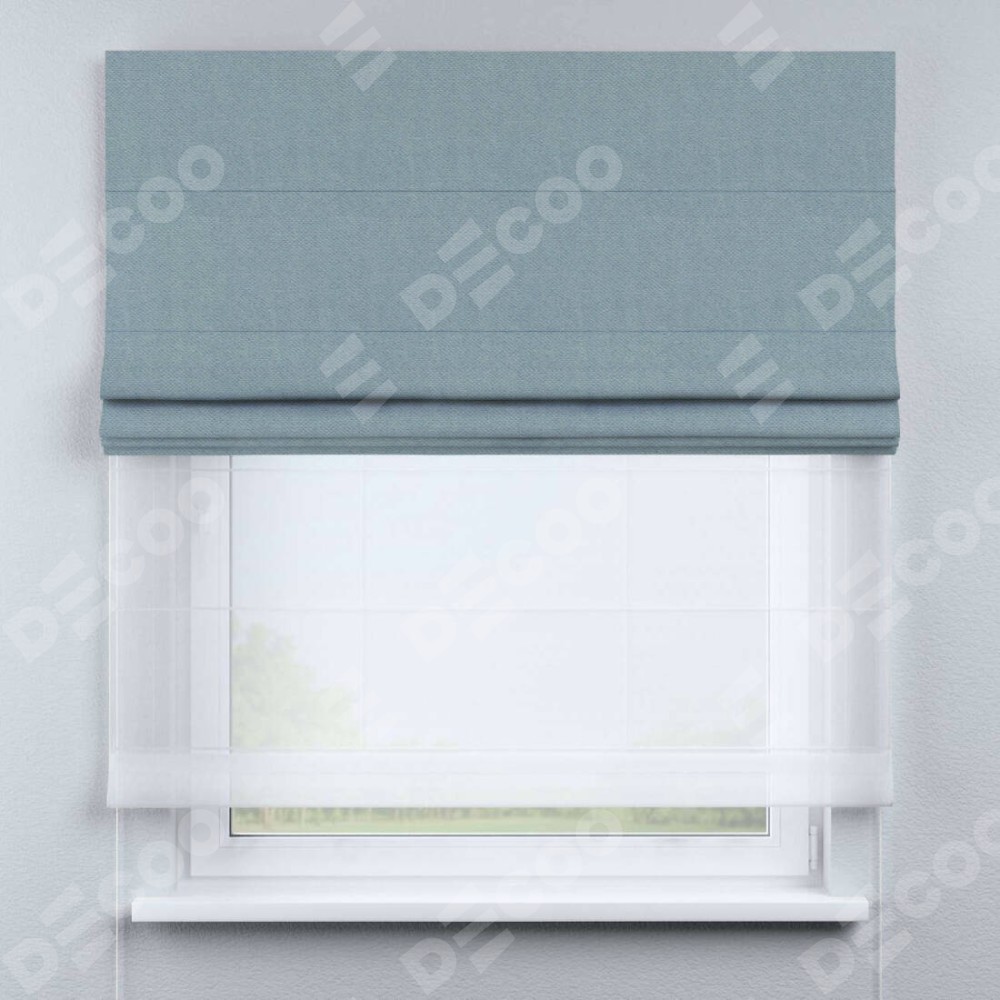 Римская штора день-ночь производителя «Cortin», используется для проёма, пошита из двух полотен, с лицевой стороны блэкаут тиснение с блеском синий артикул 34625, вторая ткань тюль (по стандарту комплектуется тюль белого цвета артикул V-01). Изнаночная сторона основного материала черного цвета, что обеспечивает необходимую светонепроницаемость. Имеет универсальный механизм и подходит для монтажа: на потолок, на стену и в нишу.