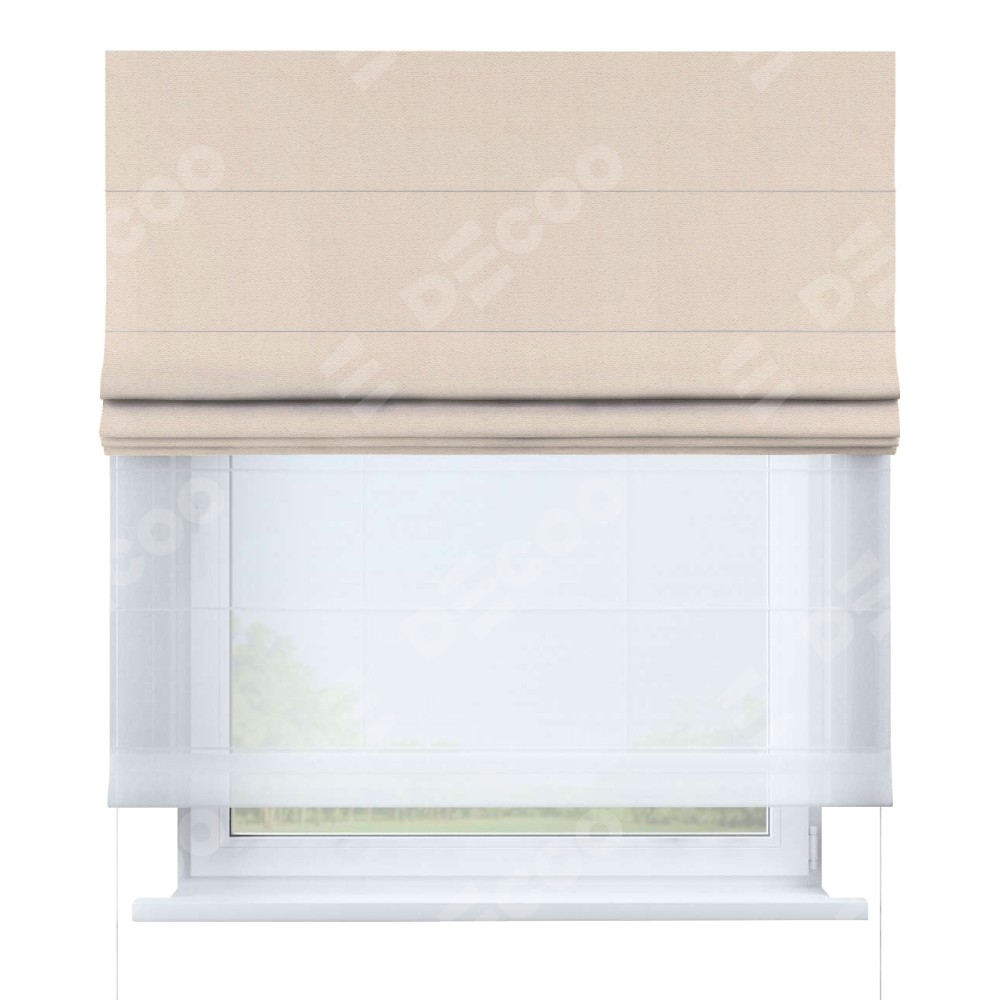 Римская штора день-ночь производителя «Cortin», используется для проёма, пошита из двух полотен, с лицевой стороны блэкаут тиснение с блеском розовая пудра артикул 34632, вторая ткань тюль (по стандарту комплектуется тюль белого цвета артикул V-01). Изнаночная сторона основного материала черного цвета, что обеспечивает необходимую светонепроницаемость. Имеет универсальный механизм и подходит для монтажа: на потолок, на стену и в нишу.