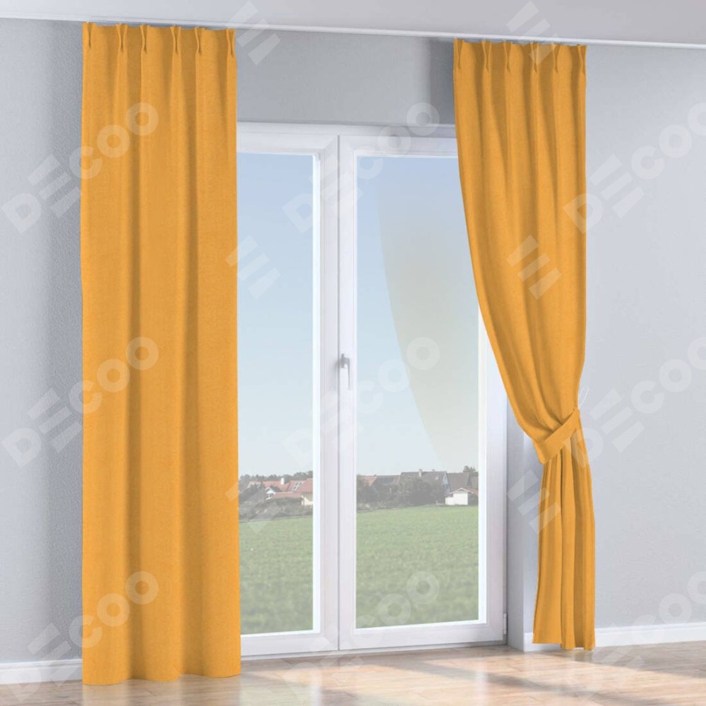 Комплект прямых штор, от производителя «Cortin», пошиты из ткани блэкаут с блеском золотой, артикул ткани 34626. С изнаночной стороны в верхней части штор пристрачивается шторная лента с декоративными складками «Кустик». Обратная сторона основного материала черного цвета, что обеспечивает необходимую светонепроницаемость. Для создания элегантных складок прямые шторы шьются по стандарту с коэффициентом 1:2 (на 100 см. ширины проёма 200 см. ширины ткани).