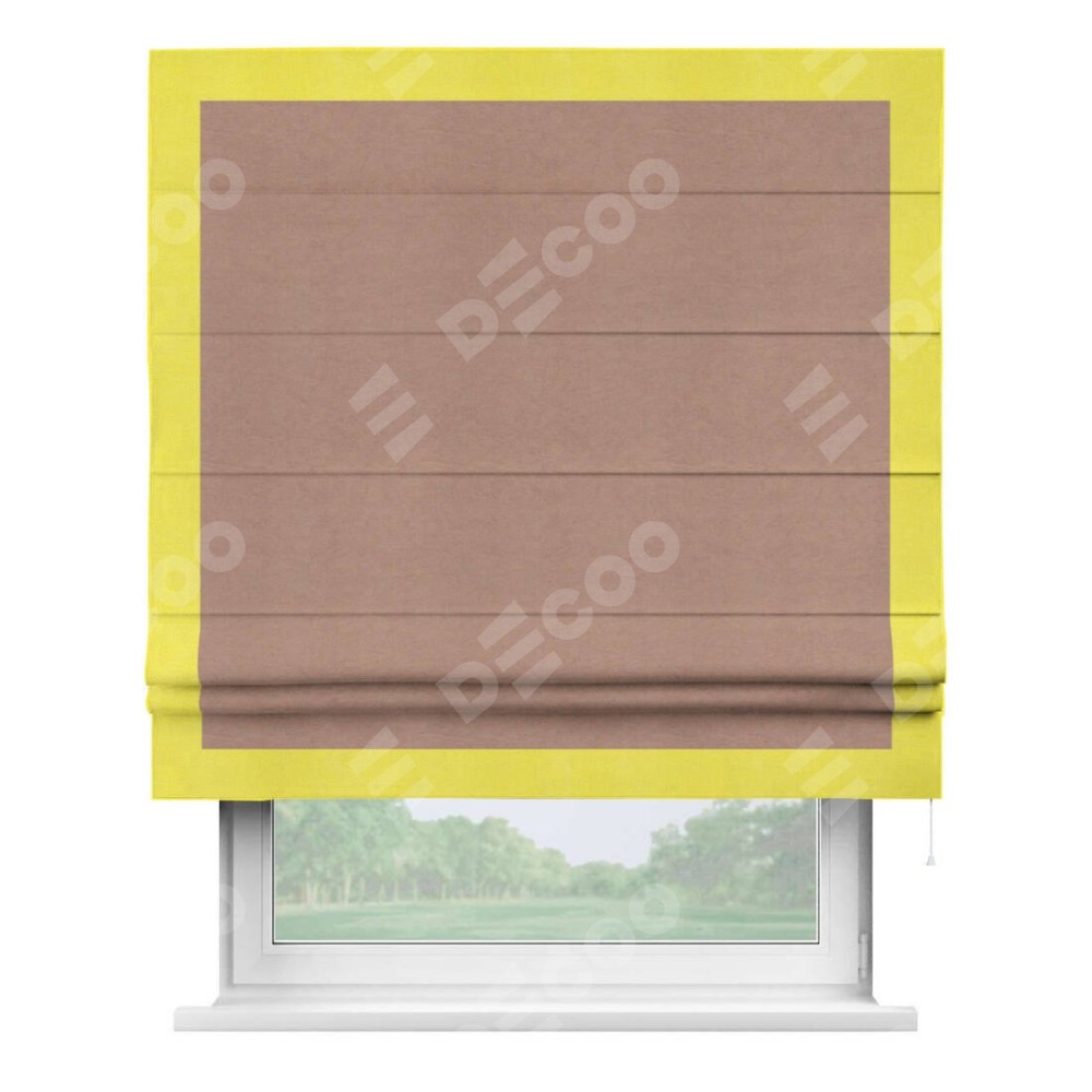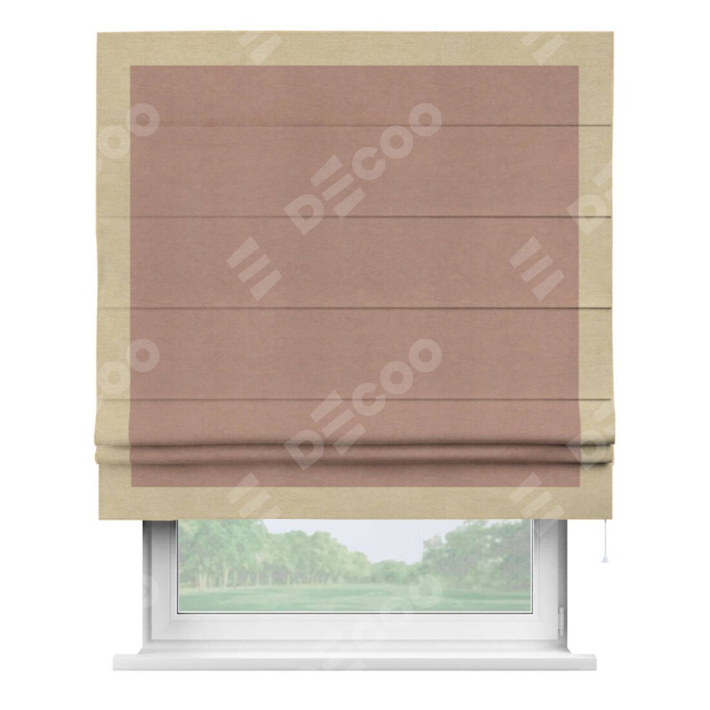 Римская штора производителя «Cortin», используется для проёма, пошита из ткани вельвет брусничный джем, артикул ткани 17750. Отделка шторы кантом «Чесс», ткань для канта используется из вельвета разной расцветки на выбор. Имеет универсальный механизм и подходит для монтажа: на потолок, на стену и в нишу.