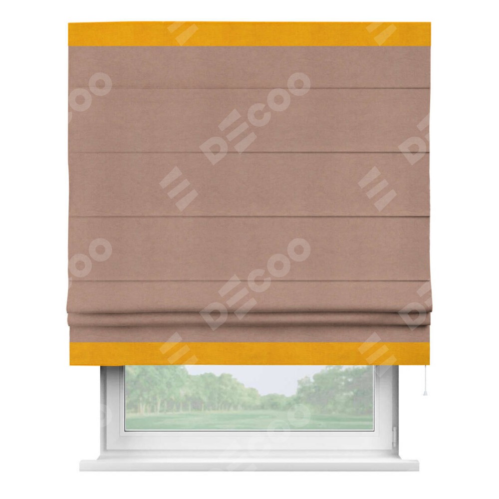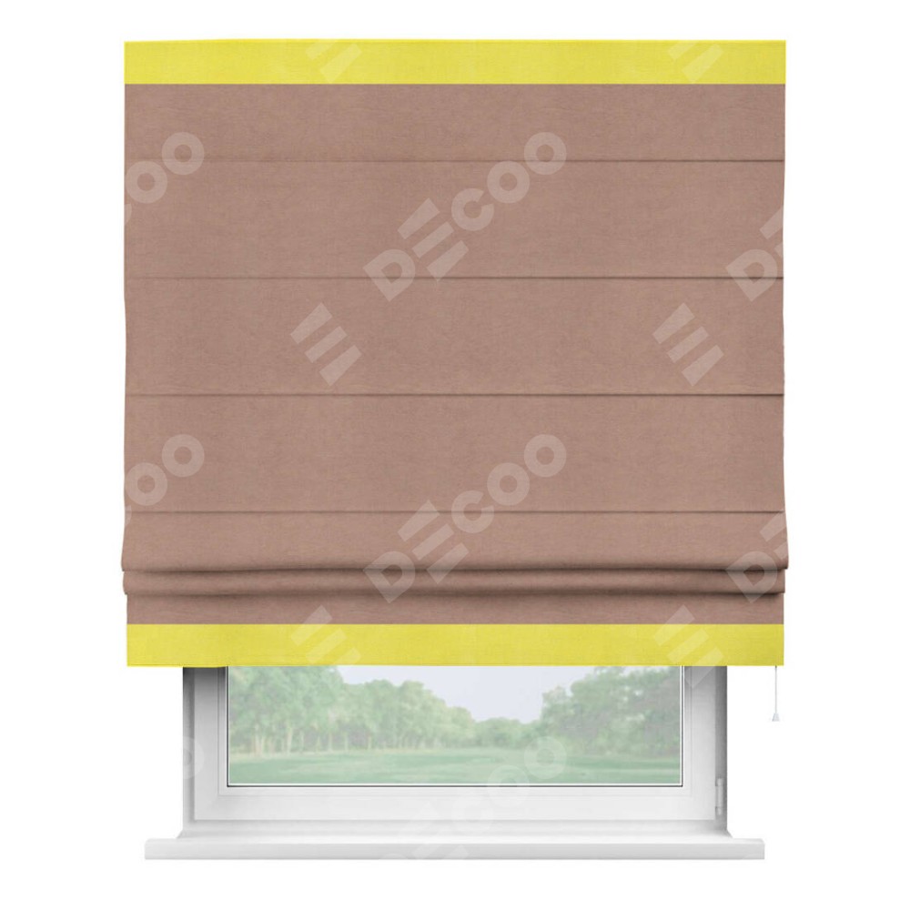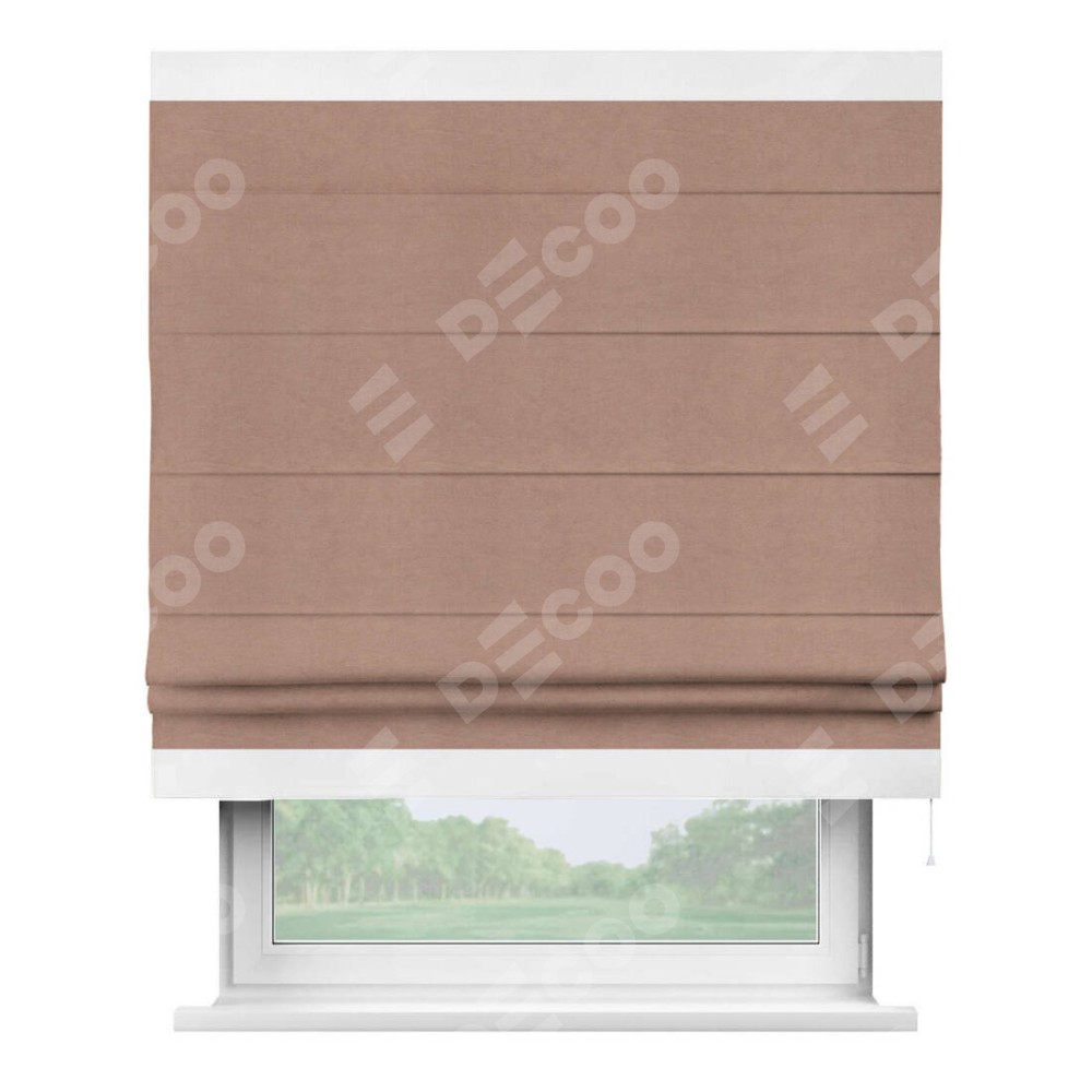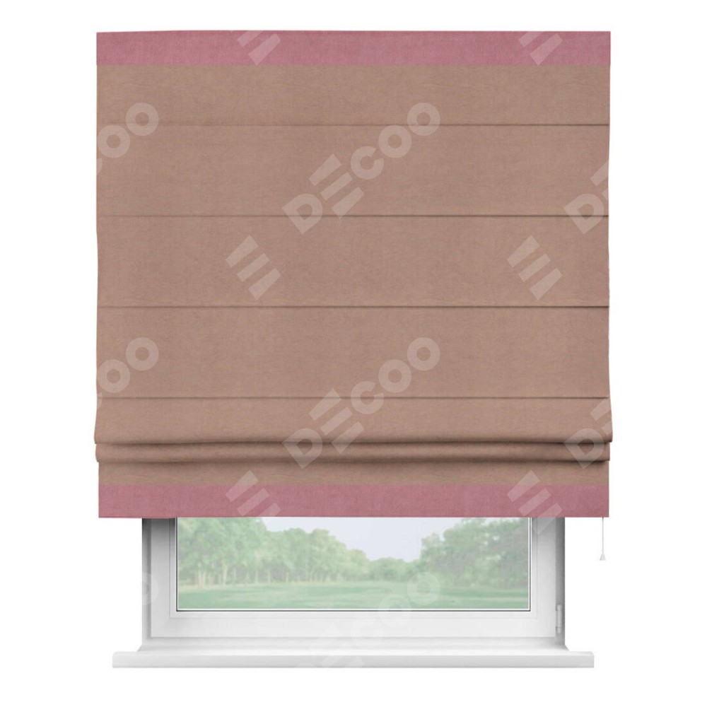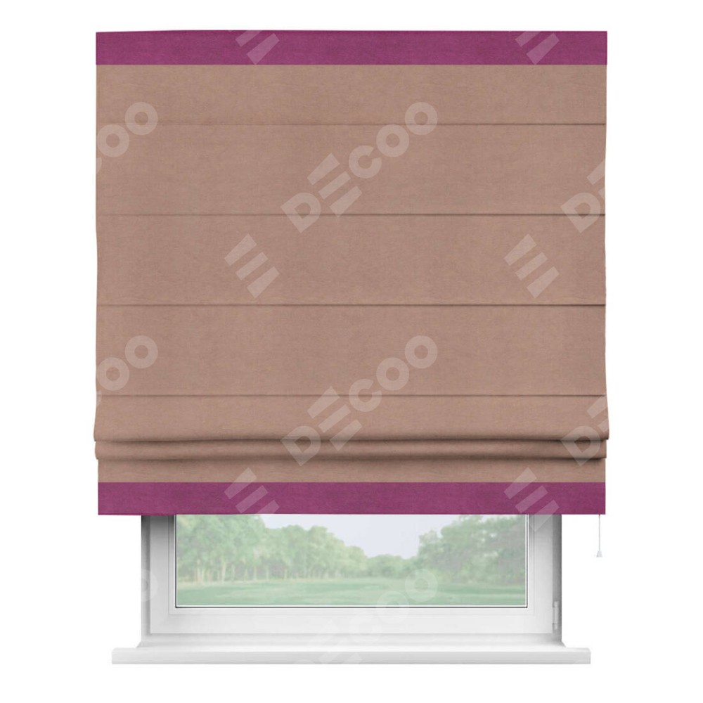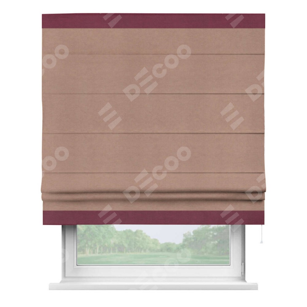 Римская штора производителя «Cortin», используется для проёма, пошита из ткани вельвет брусничный джем, артикул ткани 17750. Отделка шторы кантом «Горизонт», ткань для канта используется из вельвета разной расцветки на выбор. Имеет универсальный механизм и подходит для монтажа: на потолок, на стену и в нишу.