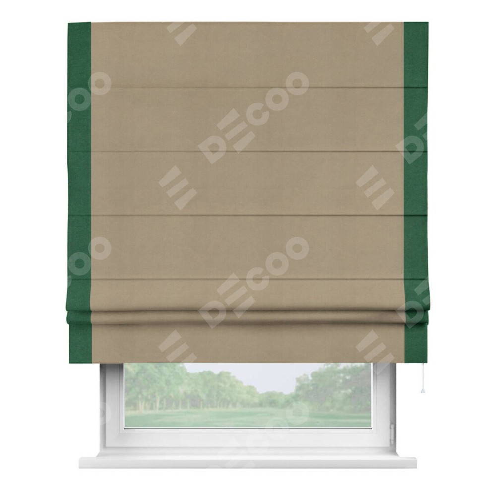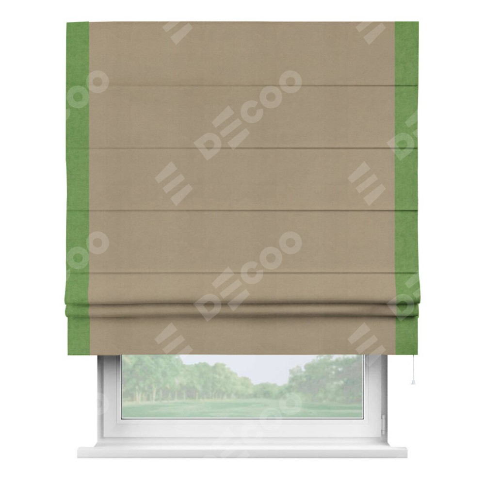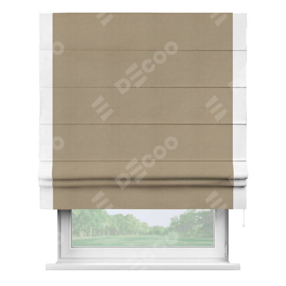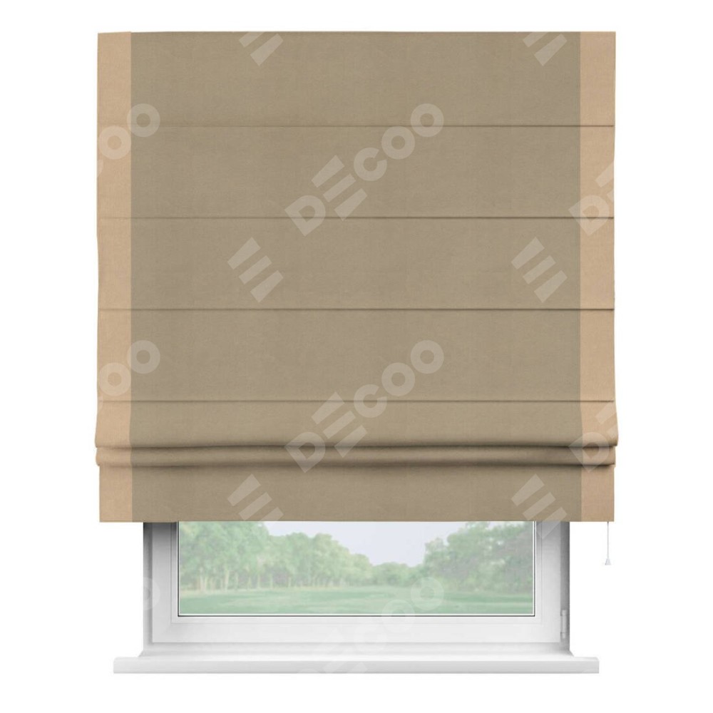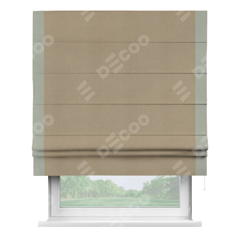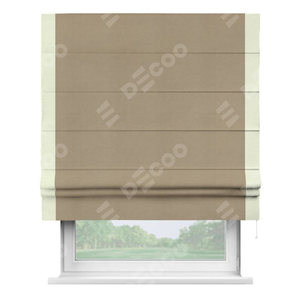 Римская штора производителя «Cortin», используется для проёма, пошита из ткани вельвет кофейный, артикул ткани 30980. Отделка шторы кантом «Стрим Дуо», ткань для канта используется из вельвета разной расцветки на выбор. Имеет универсальный механизм и подходит для монтажа: на потолок, на стену и в нишу.