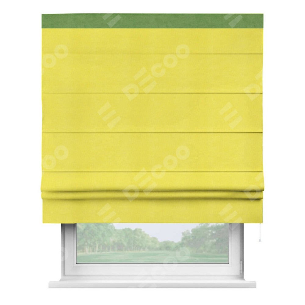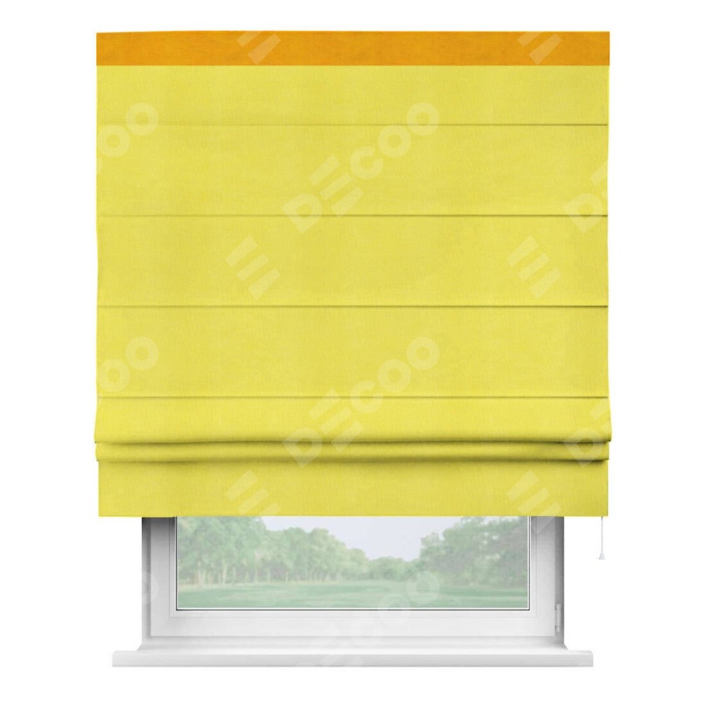 Римская штора производителя «Cortin», используется для проёма, пошита из ткани вельвет cветло-желтый, артикул ткани 30997. Отделка шторы кантом «Кинг», ткань для канта используется из вельвета разной расцветки на выбор. Имеет универсальный механизм и подходит для монтажа: на потолок, на стену и в нишу.
