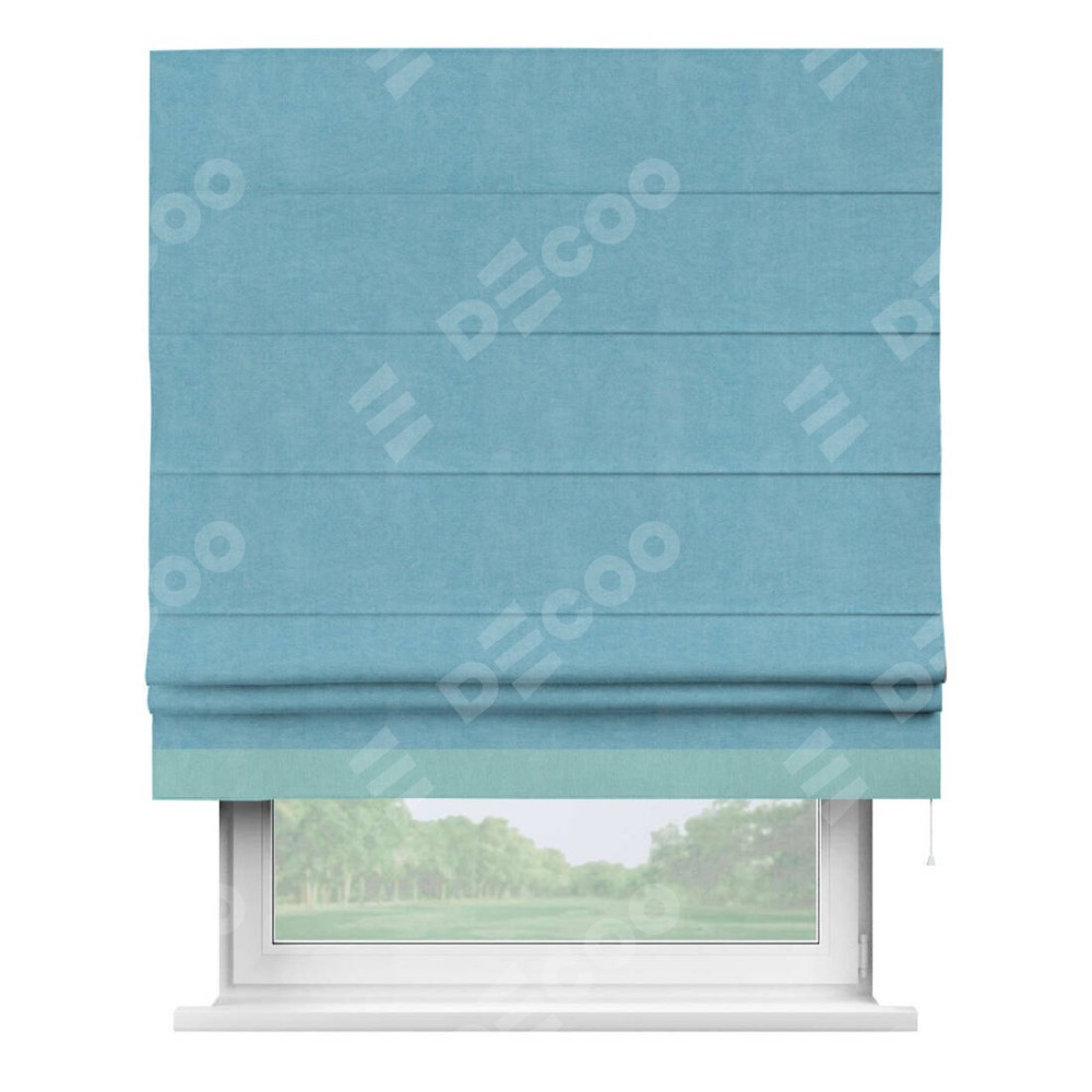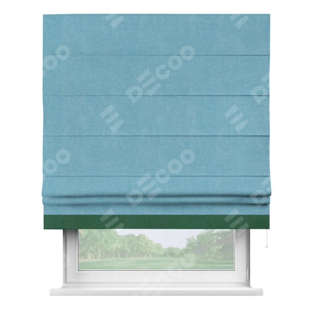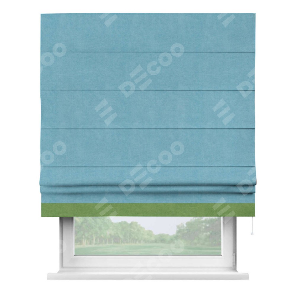 Римская штора производителя «Cortin», используется для проёма, пошита из ткани вельвет ментоловый, артикул ткани 10443. Отделка шторы кантом «Джестер», ткань для канта используется из вельвета разной расцветки на выбор. Имеет универсальный механизм и подходит для монтажа: на потолок, на стену и в нишу.