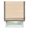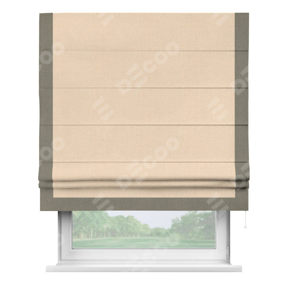 Римская штора производителя «Cortin», используется для проёма, пошита из ткани блэкаут с блеском бежевый, артикул 34627. Отделка шторы кантом «Виктория», ткань для канта используется из блэкаута с блеском разной расцветки на выбор. Изнаночная сторона материала черного цвета, что обеспечивает необходимую светонепроницаемость. Имеет универсальный механизм и подходит для монтажа: на потолок, на стену и в нишу.