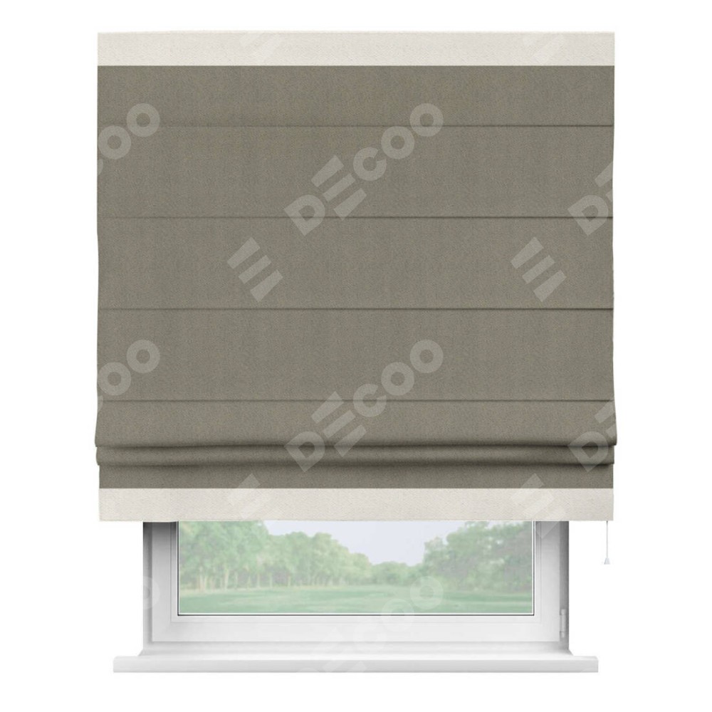 Римская штора производителя «Cortin», используется для проёма, пошита из ткани блэкаут с блеском графитовый, артикул 34648. Отделка шторы кантом «Горизонт», ткань для канта используется из блэкаута с блеском разной расцветки на выбор. Изнаночная сторона материала черного цвета, что обеспечивает необходимую светонепроницаемость. Имеет универсальный механизм и подходит для монтажа: на потолок, на стену и в нишу.