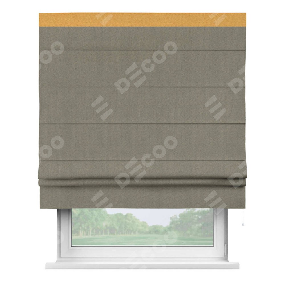Римская штора производителя «Cortin», используется для проёма, пошита из ткани блэкаут с блеском графитовый, артикул 34648. Отделка шторы кантом «Кинг», ткань для канта используется из блэкаута с блеском разной расцветки на выбор. Изнаночная сторона материала черного цвета, что обеспечивает необходимую светонепроницаемость. Имеет универсальный механизм и подходит для монтажа: на потолок, на стену и в нишу.