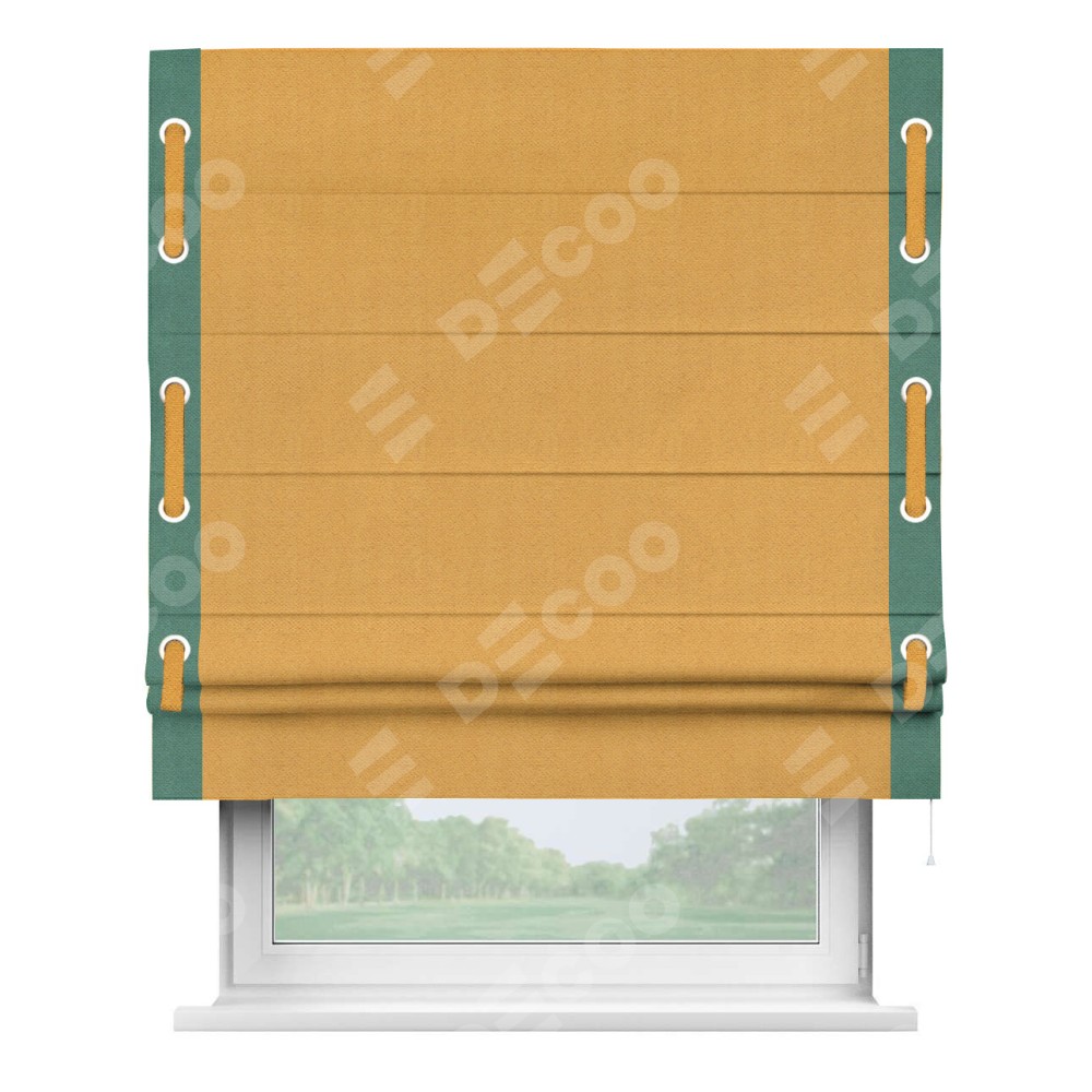 Римская штора производителя «Cortin», используется для проёма, пошита из ткани блэкаут с блеском золотой, артикул 34626. Отделка шторы кантом «Стрим Дуо» на кантах расположены люверсы с пояском, ткань для канта используется блэкаут с блеском разной расцветки на выбор. Ткань для пояска обычно используется из основной ткани шторы, а так же можно сделать из любой расцветки по желанию. Изнаночная сторона материала черного цвета, что обеспечивает необходимую светонепроницаемость. Имеет универсальный механизм и подходит для монтажа: на потолок, на стену и в нишу.