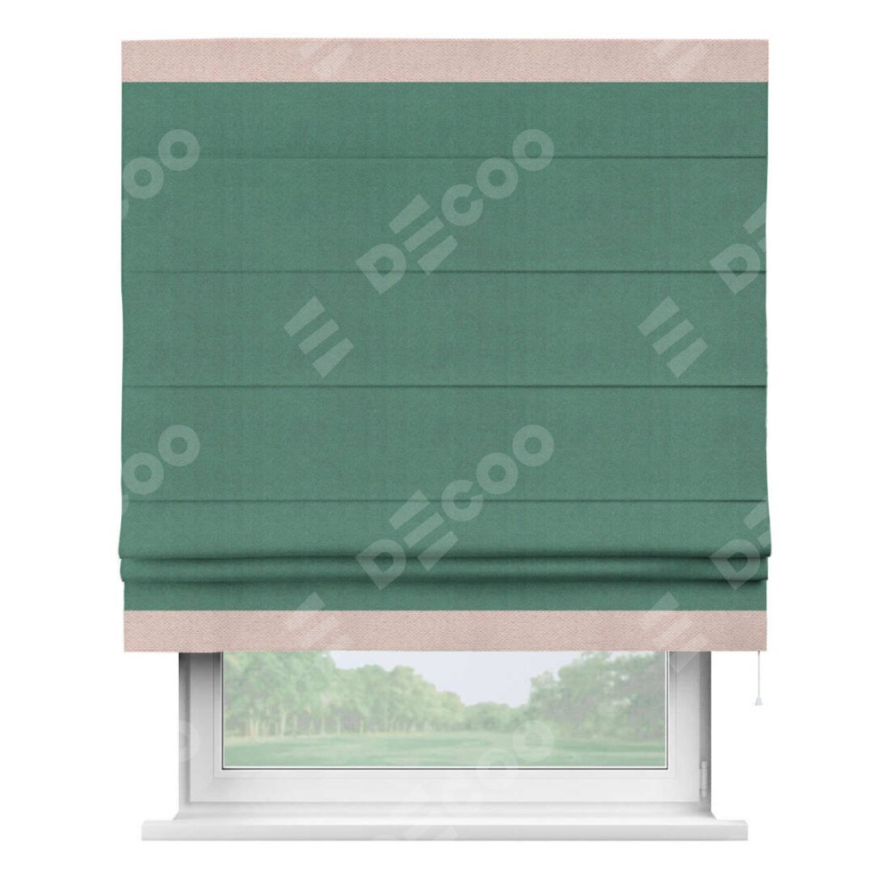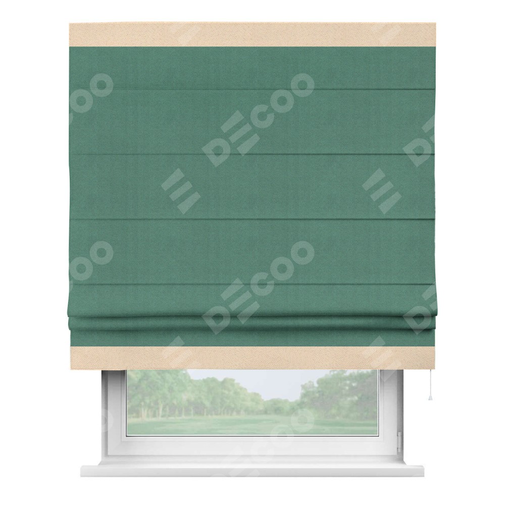 Римская штора производителя «Cortin», используется для проёма, пошита из ткани блэкаут с блеском изумрудный, артикул 34628. Отделка шторы кантом «Горизонт», ткань для канта используется из блэкаута с блеском разной расцветки на выбор. Изнаночная сторона материала черного цвета, что обеспечивает необходимую светонепроницаемость. Имеет универсальный механизм и подходит для монтажа: на потолок, на стену и в нишу.