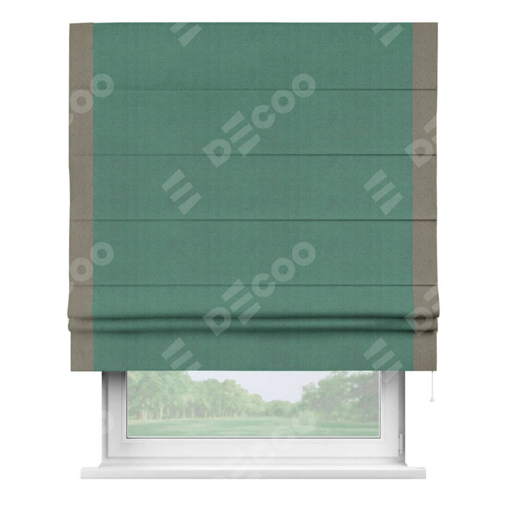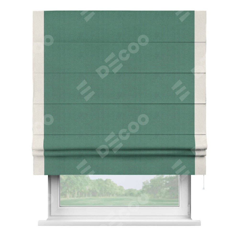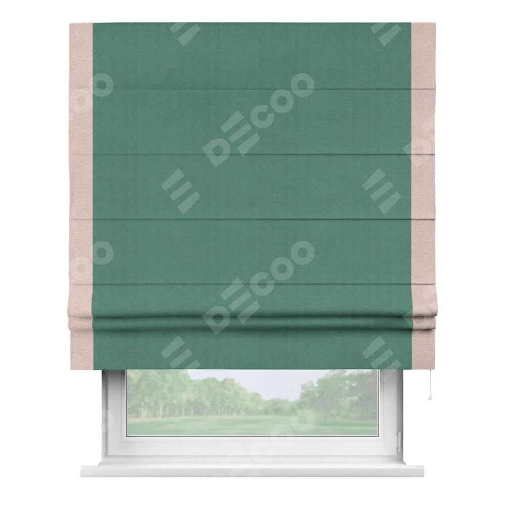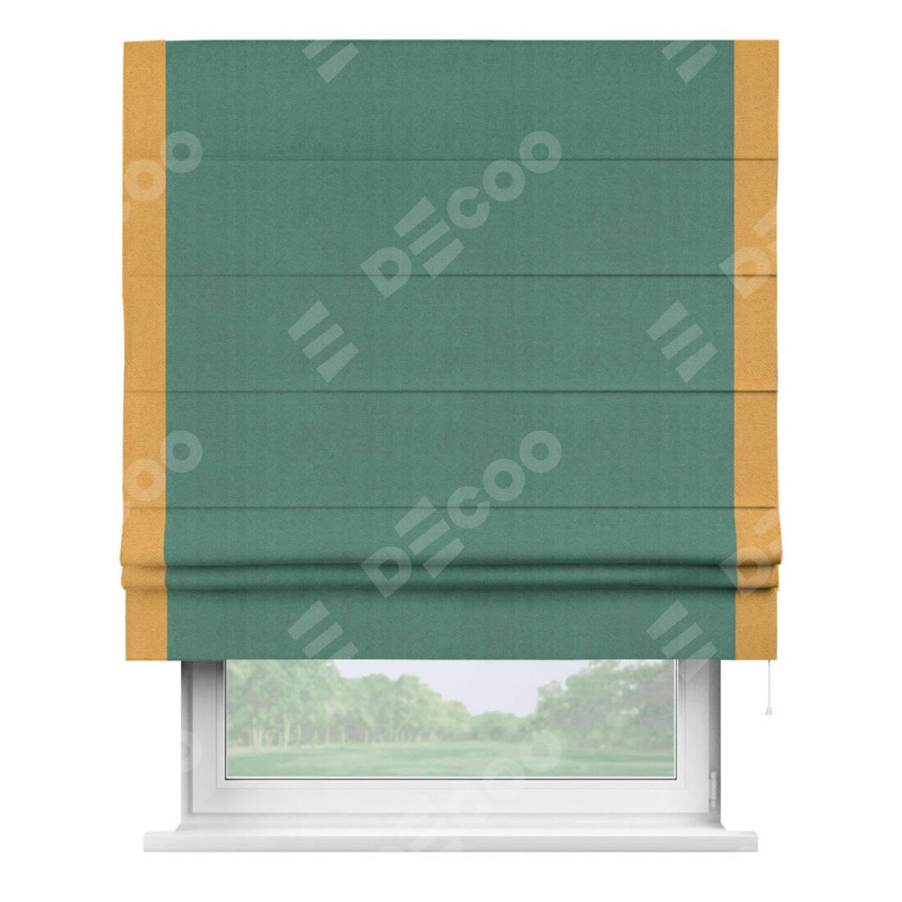 Римская штора производителя «Cortin», используется для проёма, пошита из ткани блэкаут с блеском изумрудный, артикул 34628. Отделка шторы кантом «Стрим Дуо», ткань для канта используется из блэкаута с блеском разной расцветки на выбор. Изнаночная сторона материала черного цвета, что обеспечивает необходимую светонепроницаемость. Имеет универсальный механизм и подходит для монтажа: на потолок, на стену и в нишу.