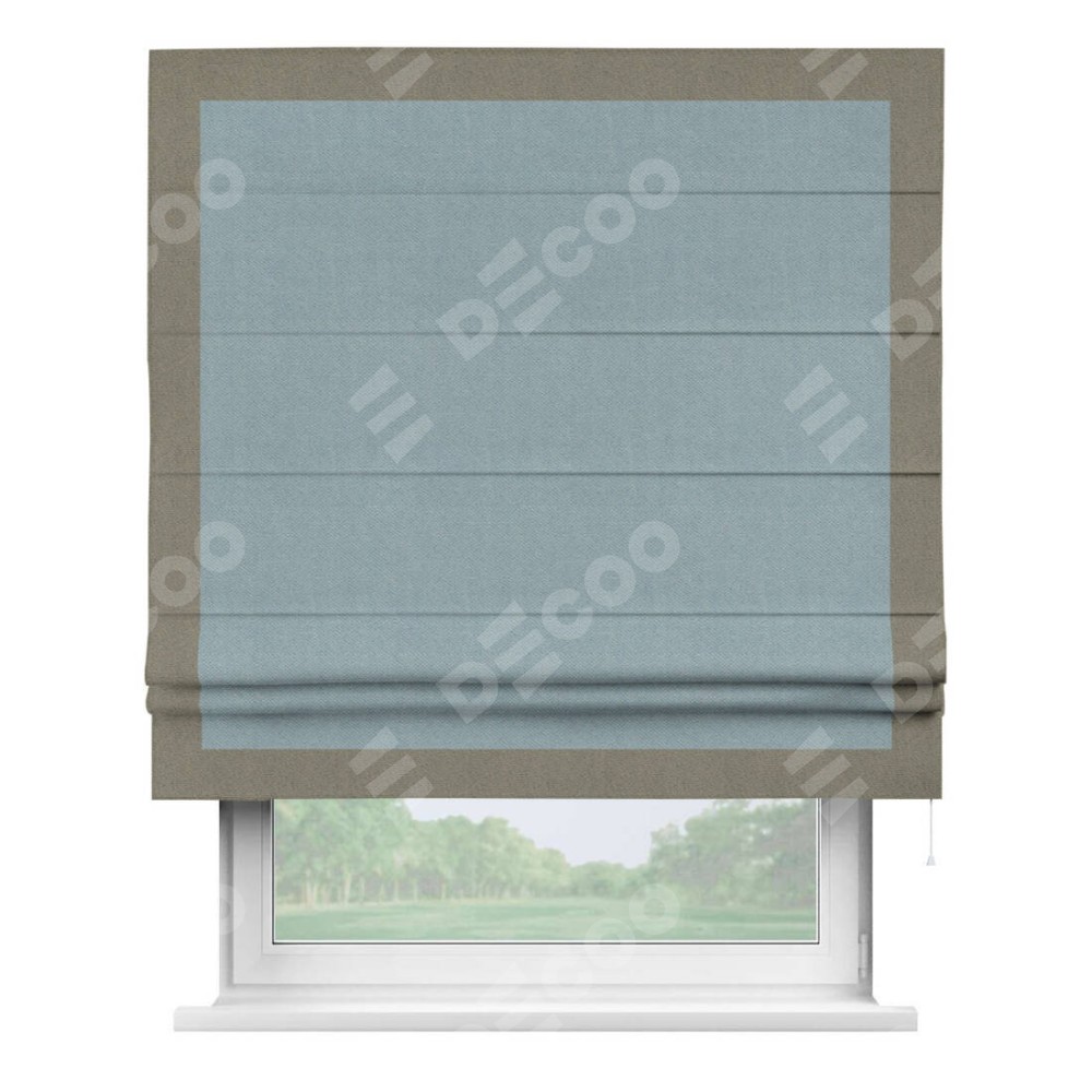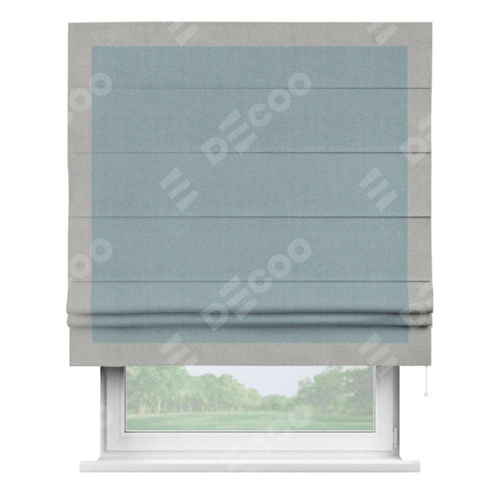 Римская штора производителя «Cortin», используется для проёма, пошита из ткани блэкаут с блеском синий, артикул 34625. Отделка шторы кантом «Чесс», ткань для канта используется из блэкаута с блеском разной расцветки на выбор. Изнаночная сторона материала черного цвета, что обеспечивает необходимую светонепроницаемость. Имеет универсальный механизм и подходит для монтажа: на потолок, на стену и в нишу.