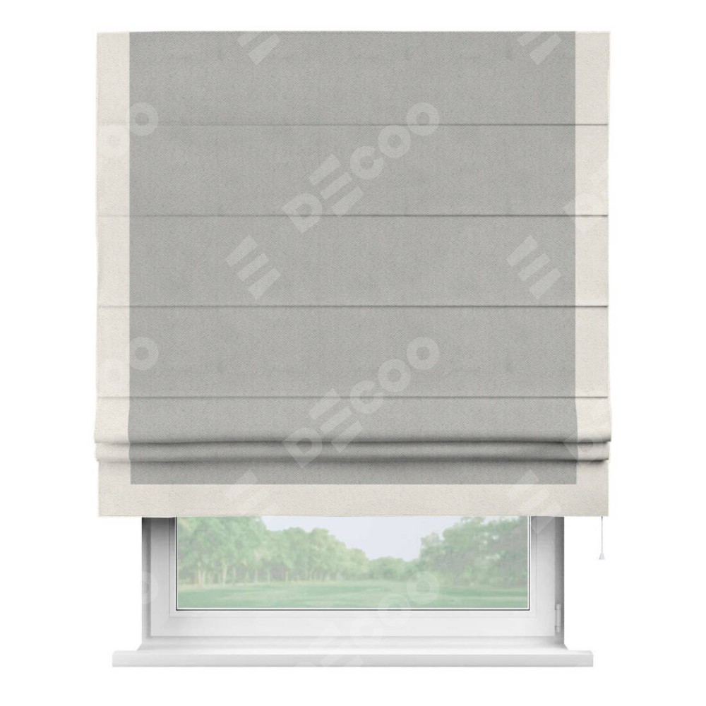 Римская штора производителя «Cortin», используется для проёма, пошита из ткани блэкаут с блеском тёмно-серый, артикул 34634. Отделка шторы кантом «Виктория», ткань для канта используется из блэкаута с блеском разной расцветки на выбор. Изнаночная сторона материала черного цвета, что обеспечивает необходимую светонепроницаемость. Имеет универсальный механизм и подходит для монтажа: на потолок, на стену и в нишу.