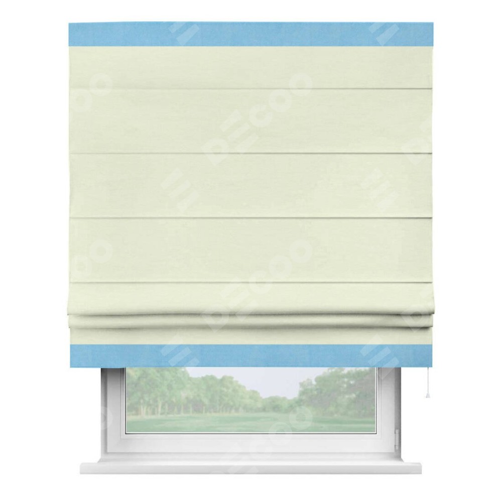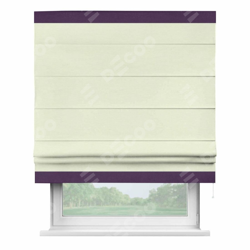 Римская штора производителя «Cortin», используется для проёма, пошита из ткани вельвет молочный, артикул ткани 85536. Отделка шторы кантом «Горизонт», ткань для канта используется из вельвета разной расцветки на выбор. Имеет универсальный механизм и подходит для монтажа: на потолок, на стену и в нишу.