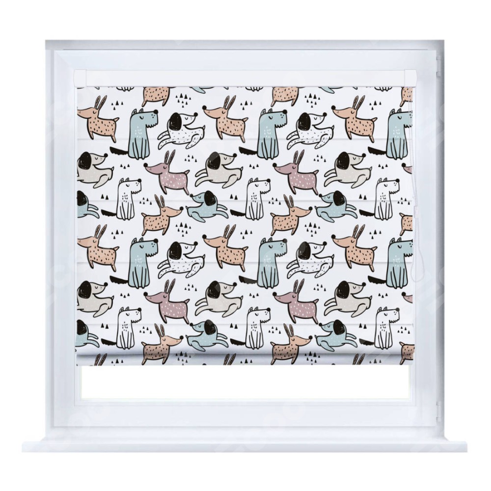 Римская штора производителя «Cortin», устанавливается на створку окна, пошита из ткани блэкаут с нанесением сублимационной печати «Очаровательные щеночки». Штора шьётся по индивидуальным размерам, для данного типа римской шторы возможная ширина от 35 до 150 см., высота до 250 см.