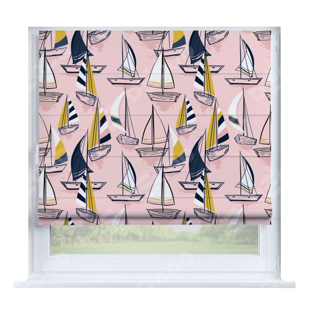 Римская штора производителя «Cortin», устанавливается на створку окна, пошита из ткани блэкаут с нанесением сублимационной печати «Парусная регата». Штора шьётся по индивидуальным размерам, для данного типа римской шторы возможная ширина от 35 до 150 см., высота до 250 см.