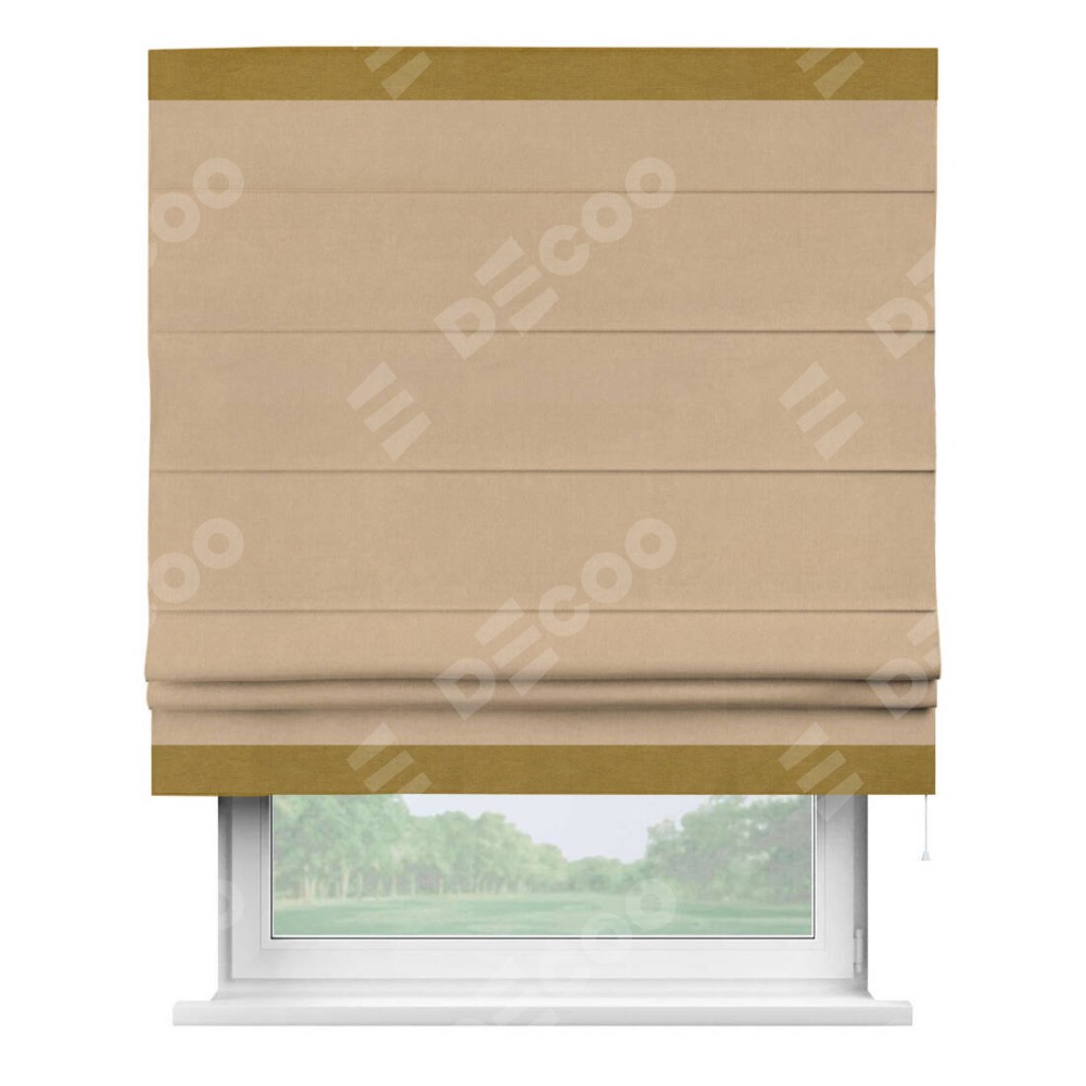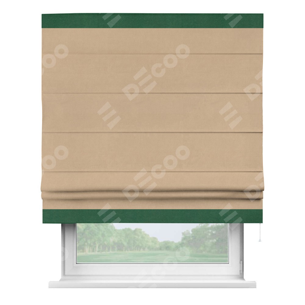 Римская штора производителя «Cortin», используется для проёма, пошита из ткани вельвет песочный, артикул ткани 17740. Отделка шторы кантом «Горизонт», ткань для канта используется из вельвета разной расцветки на выбор. Имеет универсальный механизм и подходит для монтажа: на потолок, на стену и в нишу.