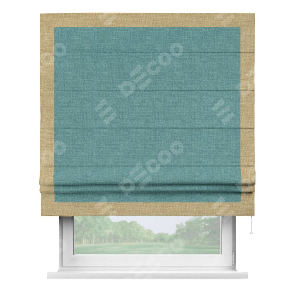 Римская штора производителя «Cortin», используется для проёма, пошита из ткани лён бирюза, артикул 7446. Отделка шторы кантом «Чесс», ткань для канта используется из льна разной расцветки на выбор. Имеет универсальный механизм и подходит для монтажа: на потолок, на стену и в нишу.