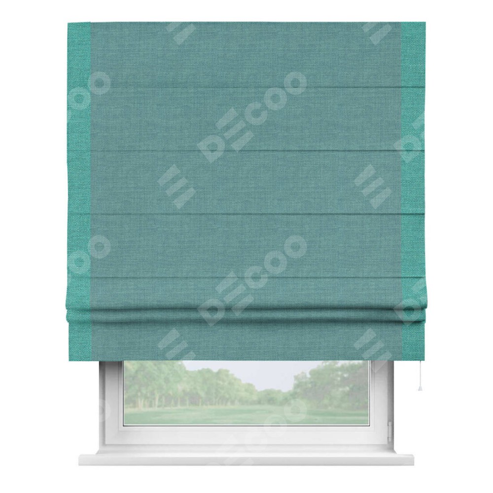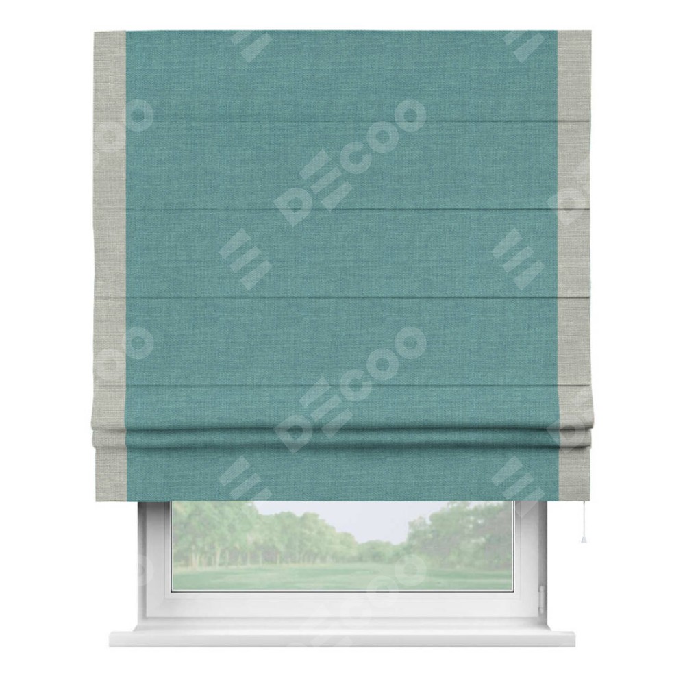 Римская штора производителя «Cortin», используется для проёма, пошита из ткани лён бирюза, артикул 7446. Отделка шторы кантом «Стрим Дуо», ткань для канта используется из льна разной расцветки на выбор. Имеет универсальный механизм и подходит для монтажа: на потолок, на стену и в нишу.