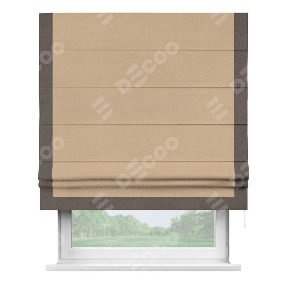 Римская штора производителя «Cortin», используется для проёма, пошита из ткани вельвет песочный, артикул ткани 17740. Отделка шторы кантом «Виктория», ткань для канта используется из вельвета разной расцветки на выбор. Имеет универсальный механизм и подходит для монтажа: на потолок, на стену и в нишу.