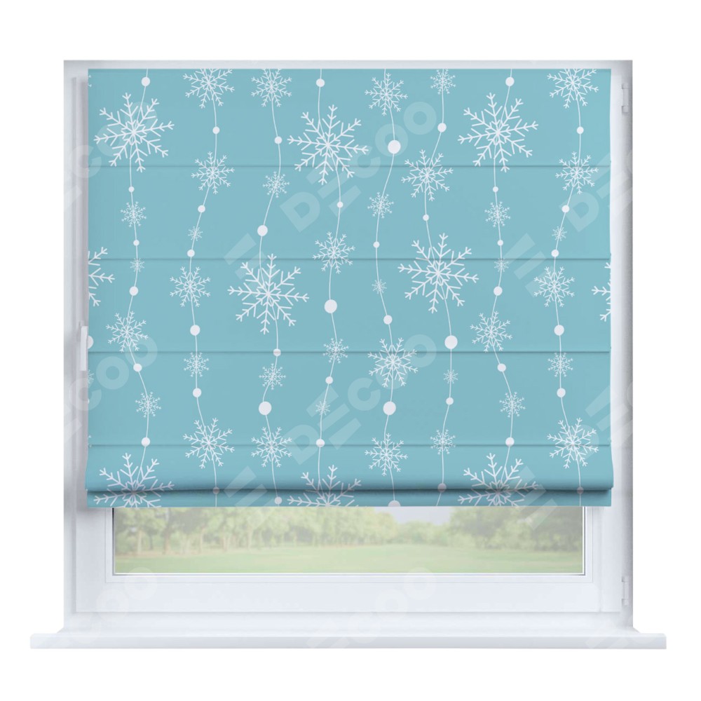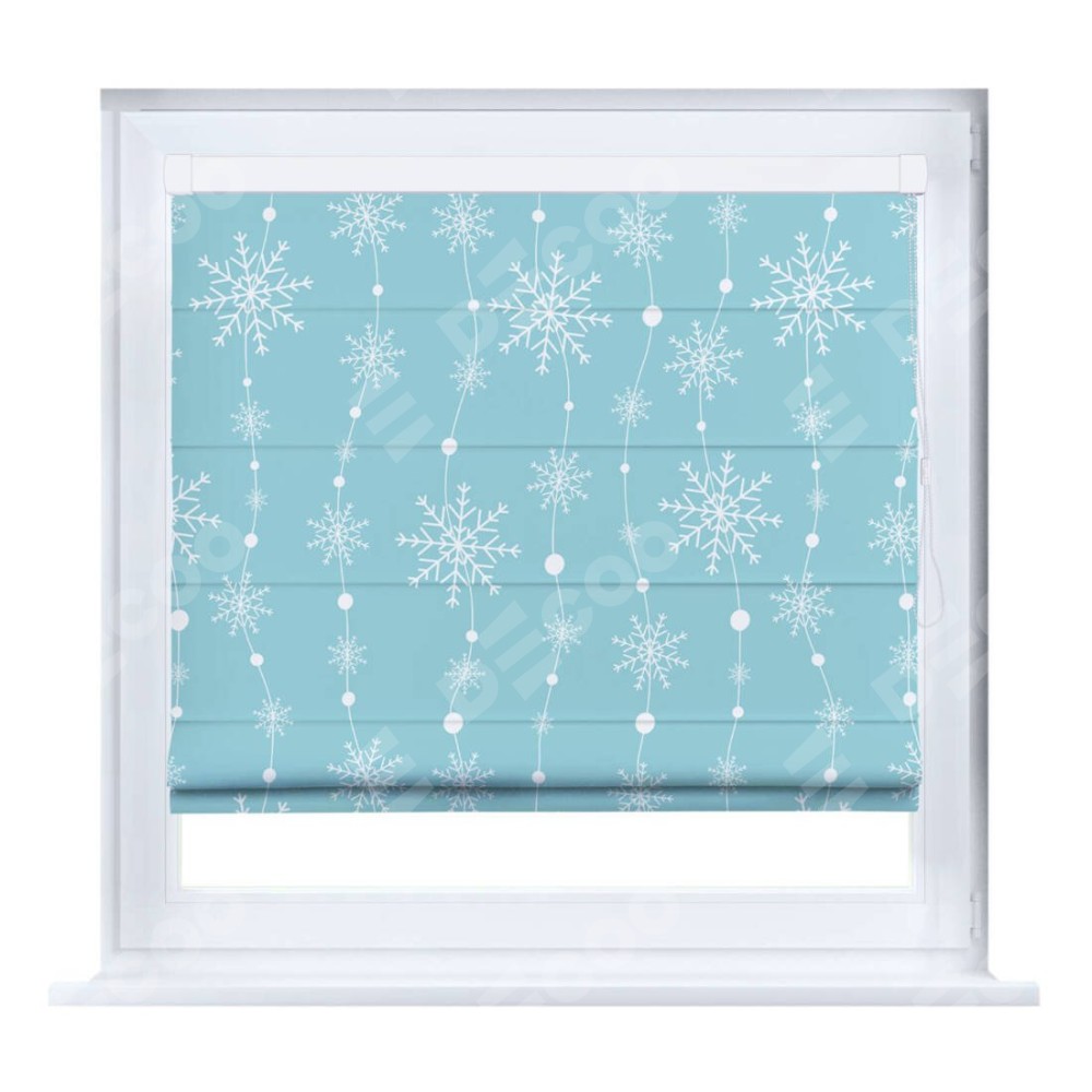 Римская штора производителя «Cortin», устанавливается на створку окна, пошита из ткани блэкаут с нанесением сублимационной печати «Гирлянда из снежинок». Штора шьётся по индивидуальным размерам, для данного типа римской шторы возможная ширина от 35 до 150 см., высота до 250 см.