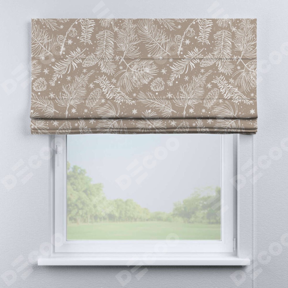 Римская штора производителя «Cortin», используется для проёма, пошита из ткани блэкаут с нанесением сублимационной печати «Заснеженный лес». Имеет универсальный механизм и подходит для монтажа: на потолок, на стену и в нишу.