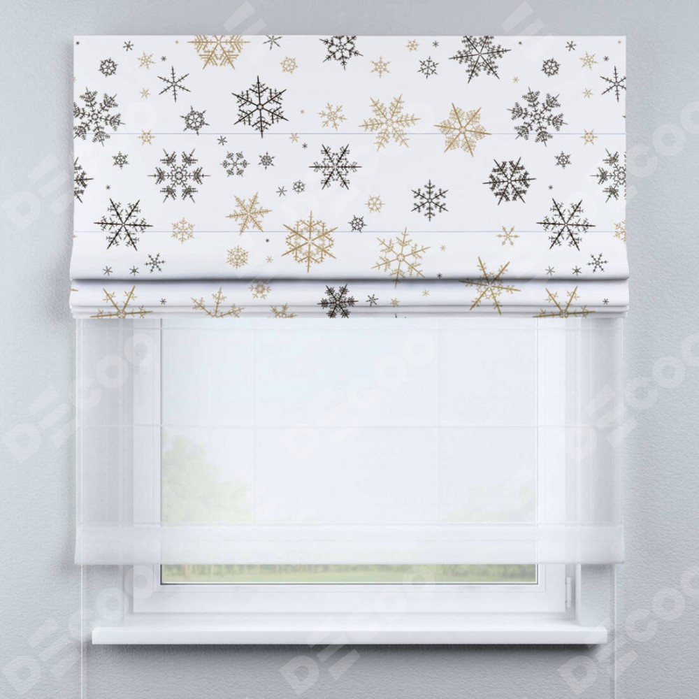 Римская штора «Кортин» день-ночь «Зимняя метель» доступна к заказу по по вашим размерам. Рабочий артикул: 19780. будет зависеть от размеров и стартует от 5 300 руб. В интернет-магазине Decoo вы сможете заказать товар в любых размерных вариациях.