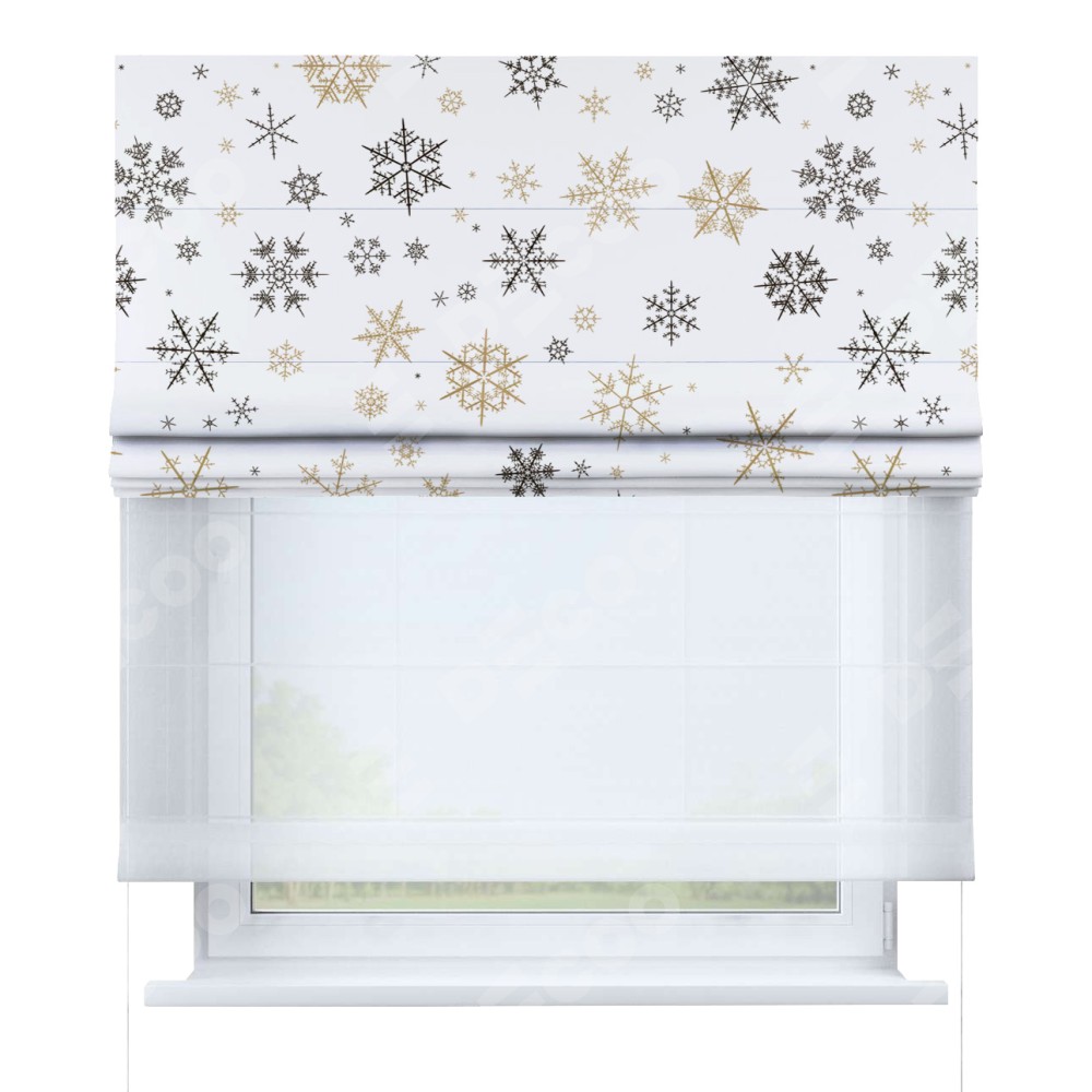Римская штора день-ночь производителя «Cortin», используется для проёма, пошита из двух полотен, с лицевой блэкаут с нанесением сублимационной печати «Зимняя метель», вторая ткань тюль (по стандарту комплектуется тюль белого цвета артикул V-01). Имеет универсальный механизм и подходит для монтажа: на потолок, на стену и в нишу.