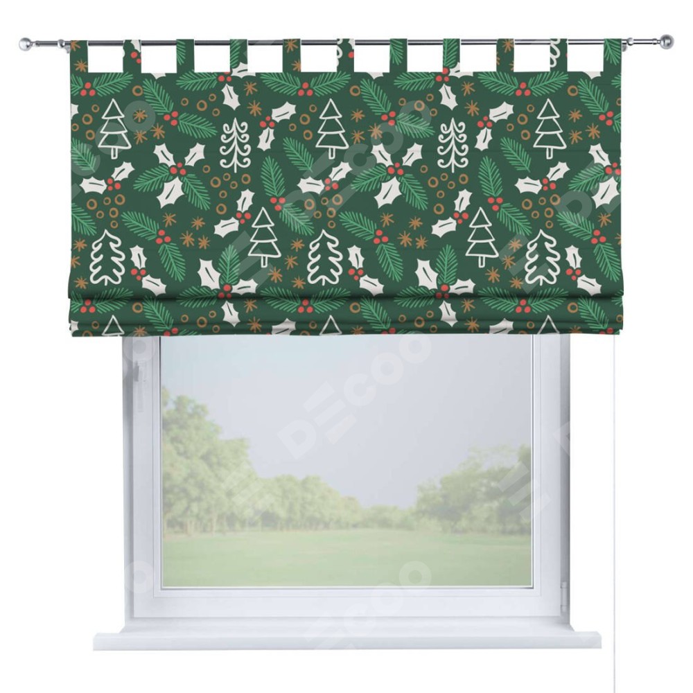 Римская штора производителя «Cortin», используется для проёма, пошита из ткани блэкаут с нанесением сублимационной печати «Рождественский узор». Данная модель пошита на петлях, комплектуется на выбор круглым карнизом и подходит для монтажа на стену. Римская штора на петлях имеет простую систему регулировки высоты, отличительным преимуществом данной модели является простой способ монтажа. Достаточно повесить ее на трубу и штора готова!