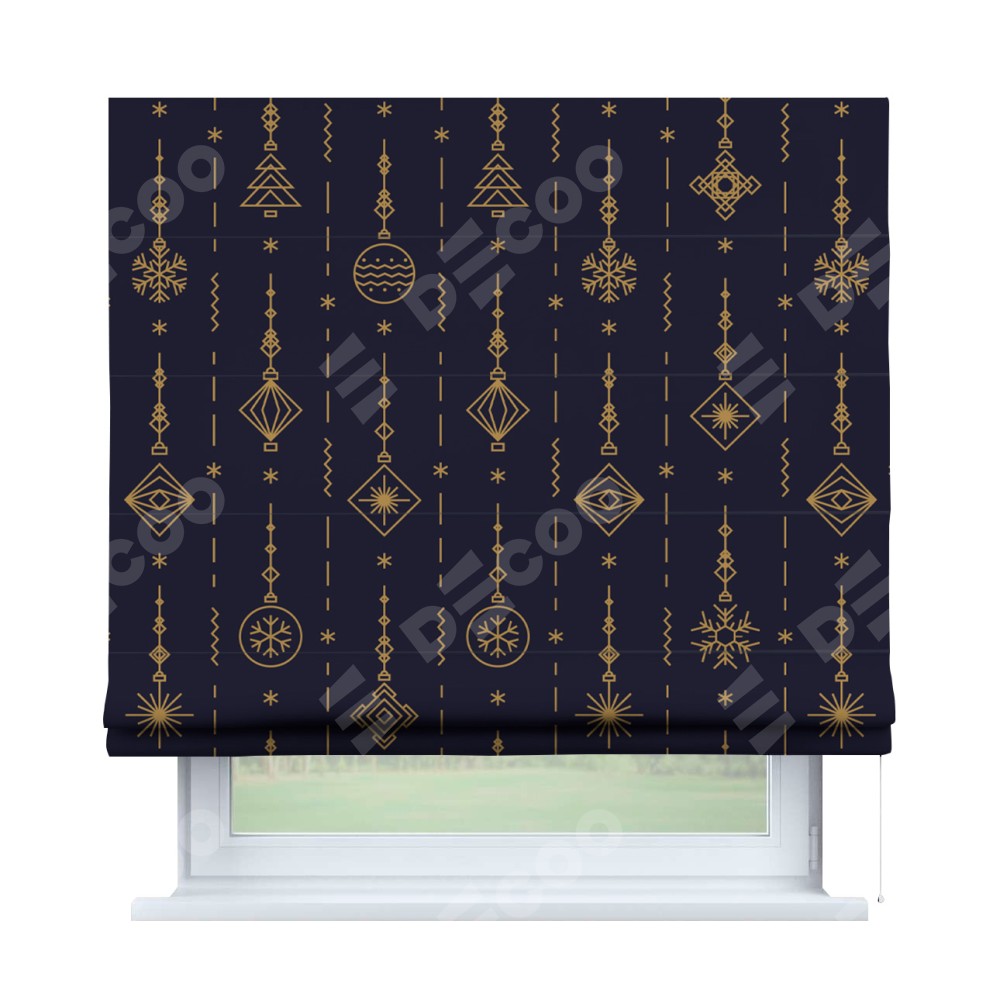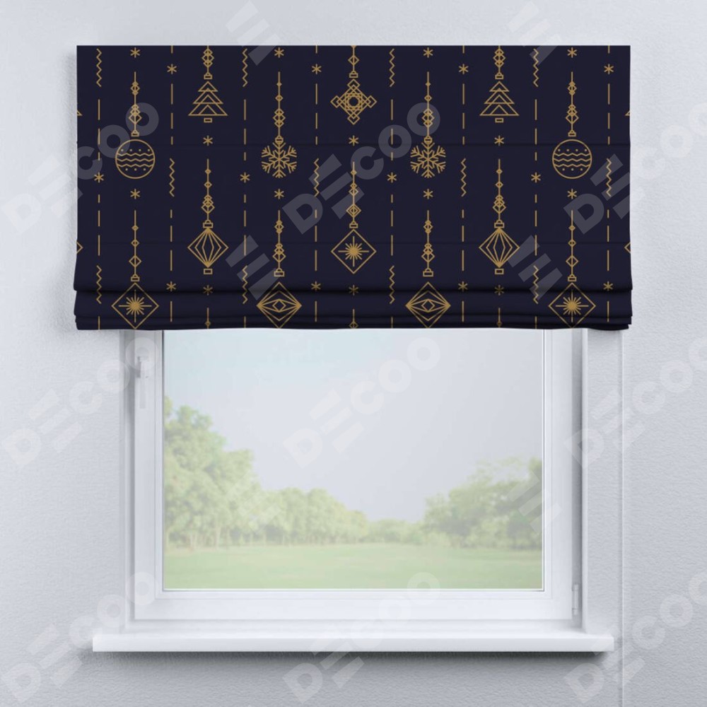 Римская штора производителя «Cortin», используется для проёма, пошита из ткани блэкаут с нанесением сублимационной печати «Сияние гирлянд». Имеет универсальный механизм и подходит для монтажа: на потолок, на стену и в нишу.