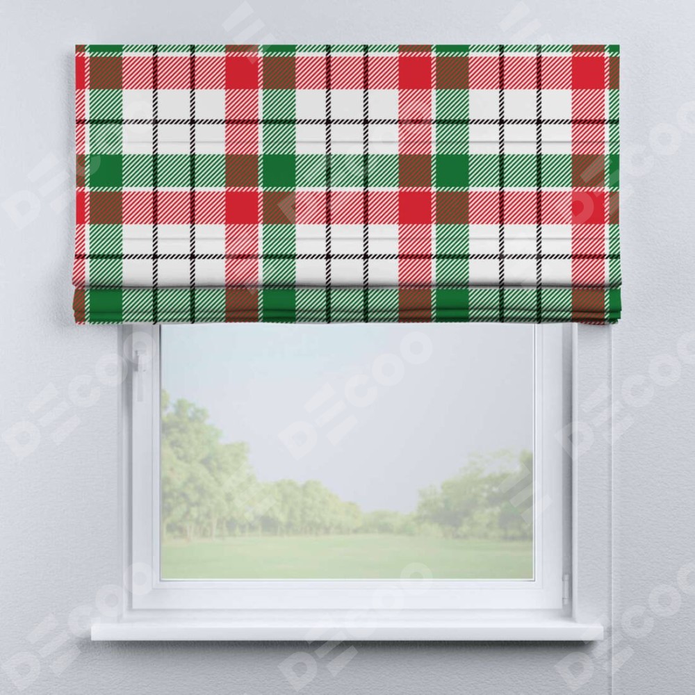 Римская штора производителя «Cortin», используется для проёма, пошита из ткани блэкаут с нанесением сублимационной печати «Трёхцветная клетка». Имеет универсальный механизм и подходит для монтажа: на потолок, на стену и в нишу.