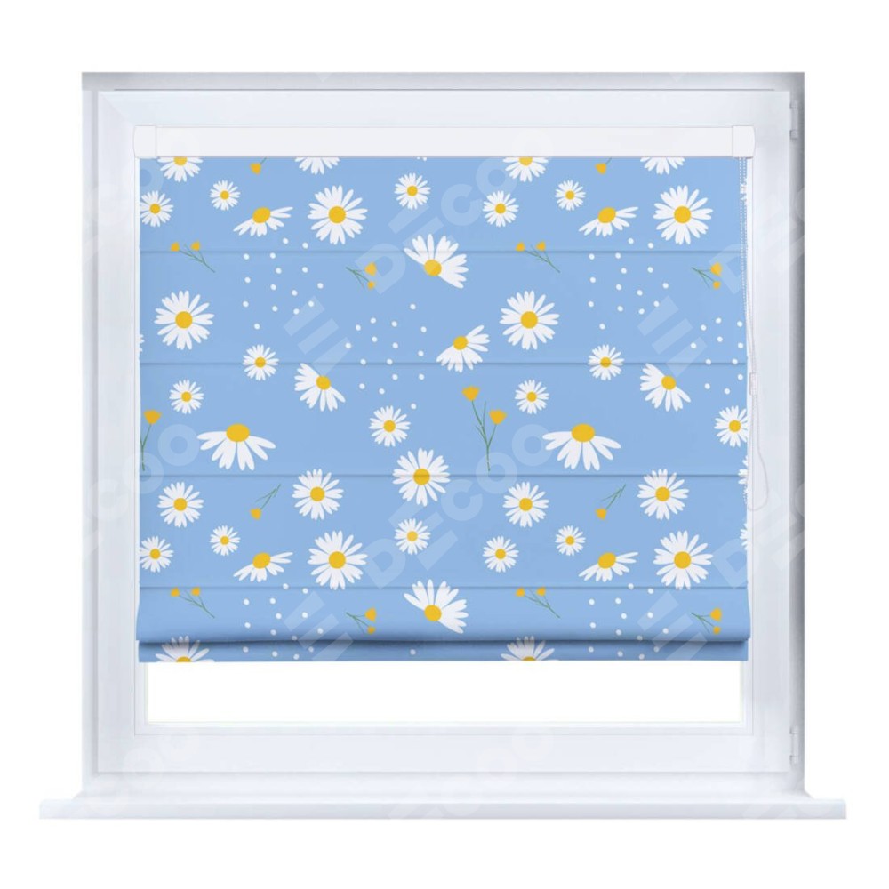 Римская штора производителя «Cortin», устанавливается на створку окна, пошита из ткани блэкаут с нанесением сублимационной печати «Ромашки на голубом». Штора шьётся по индивидуальным размерам, для данного типа римской шторы возможная ширина от 35 до 150 см., высота до 250 см.