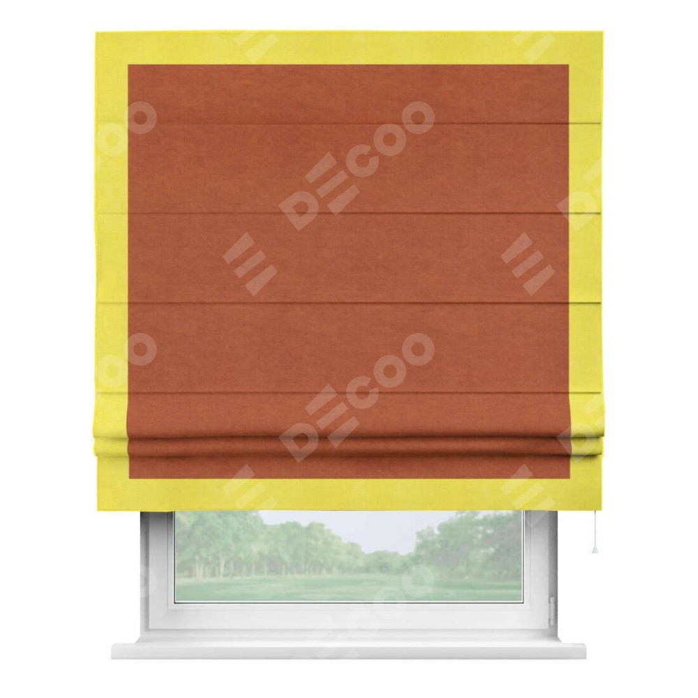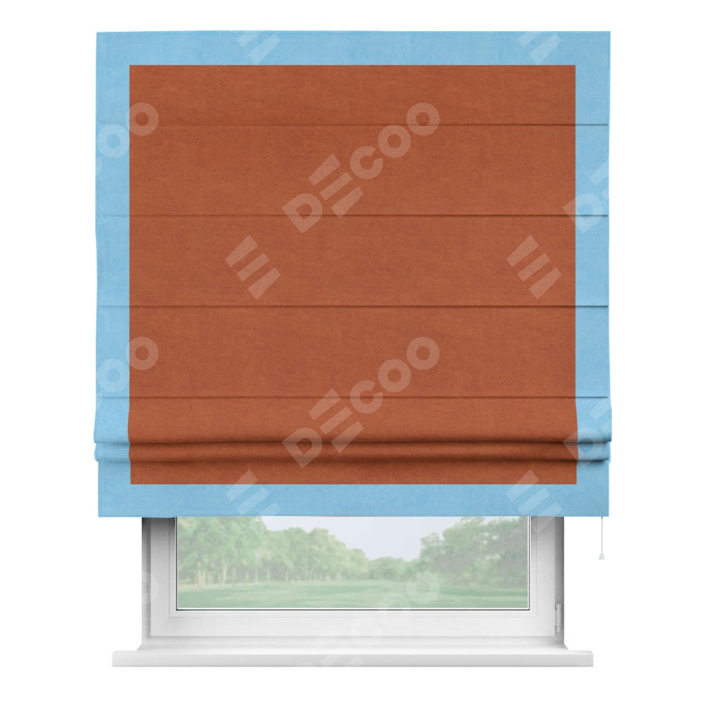 Римская штора производителя «Cortin», используется для проёма, пошита из ткани вельвет терракотовый, артикул ткани 85548. Отделка шторы кантом «Чесс», ткань для канта используется из вельвета разной расцветки на выбор. Имеет универсальный механизм и подходит для монтажа: на потолок, на стену и в нишу.
