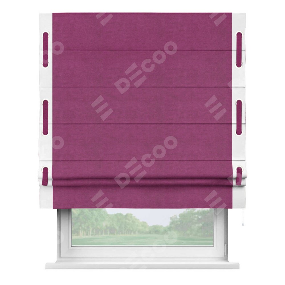 Римская штора «Кортин» с кантом Стрим Дуо (люверсы с пояском), для проема, ткань вельвет фиолетовый представлена к заказу по по вашим размерам. Её артикул: 2066. будет зависеть от размерных характеристик и будет начинаться от 5 425 руб. В интернет-магазине Decoo вы сможете выбрать товар в любых вариациях.